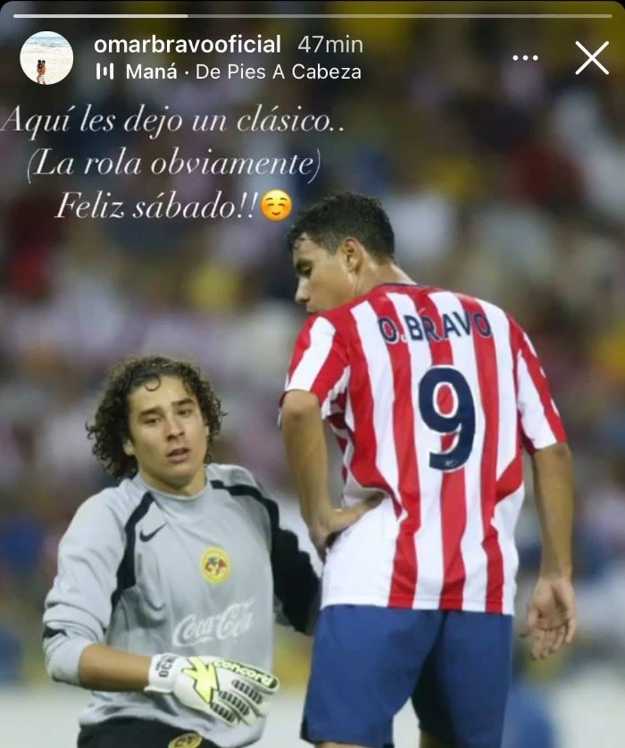 Se sigue calentando el duelo entre Chivas y América del próximo domingo, y ahora fue el ex jugador rojiblanco Omar Bravo, quien se encargó de mandarle un mensaje a las Águilas. A través de sus redes sociales, el máximo anotador en la historia del Rebaño colocó una imagen donde se le ve a él de pie ante Guillermo Ochoa, con el mensaje "Aquí les dejo un clásico.. (la rola obviamente)" hablando de la canción "De pies a cabeza" de Grupo Maná con la que acompaño la publicación. Omar Bravo se une a la lista de ex jugadores de Chivas que se han encargado de dar picantes declaraciones rumbo al Clásico Nacional como Adolfo Bautista, Carlos Reinoso y Ramón Ramírez. AJ