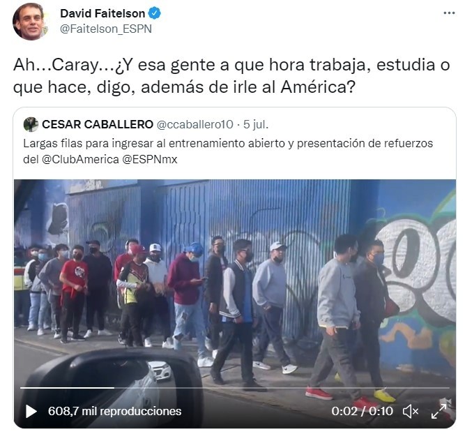 Una vez más el polémico periodista deportivo, David Faitelson, está en el ojo del huracán luego de que recriminara a la afición del Club América por asistir al Estadio Azteca a la presentación de los refuerzos de las Águilas. A través de su cuenta de Twitter, David Faitelson compartió el video publicado por un reportero de ESPN en el que se mostraban las largas filas para ingresar al Estadio Azteca. Fiel a su estilo, el periodista acompañó la publicación con un mensaje en el que cuestionó las ocupaciones del americanismo. "Ah...Caray...¿Y esa gente a qué hora trabaja, estudia o qué hace, digo, además de irle al América?", fue el mensaje que publicó Faitelson en sus redes sociales. Estas palabras no han sido bien recibidas por el americanismo y la mayoría de los mensajes de respuesta son insultos para Faitelson. Otros tantos lo han tomado con humor y algunos más le han respondido a David Faitelson que se enfoque en cosas verdaderamente importantes y no en lo que haga o deje de hacer el americanismo con su tiempo. JL