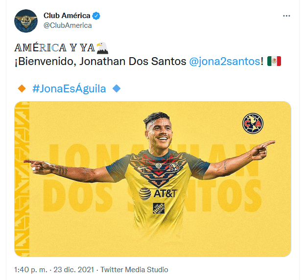 Las Águilas del América le adelantaron la Navidad a sus aficionados, al anunciar este jueves antes de Navidad que Jonathan dos Santos será su jugador para el Torneo Clausura 2022.De acuerdo con información de medios nacionales, el jugador mexicano estará vinculado con el América por los siguientes dos años.Se había especulado la llegada del menor de los dos Santos al equipo, aunque también se había dicho que el fichaje podría no ocurrir tras el paso desapercibido de su hermana, Giovani.El jugador canterano del Barcelona fue buscado por Tigres, y según reportes, también por Rayados del Monterrey. Antes de llegar al América, militó en Los Angeles Galaxy, Villarreal y el equipo blaugrana.OF