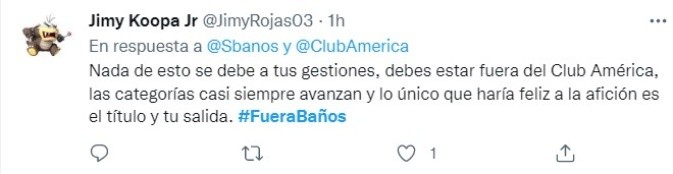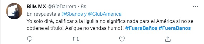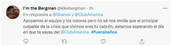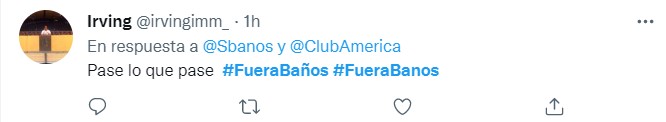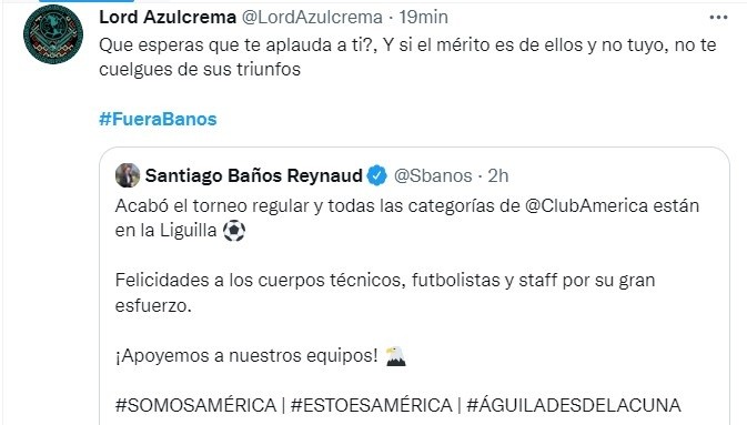 El mal inicio que tuvo el Club América en el Clausura 2022, vivió su punto más ríspido en la Jornada 8 cuando las Águilas cayeron al último lugar de la tabla general, situación que provocó el despido de Santiago Solari del banquillo azulcrema y la ruptura definitiva entre la afición y el director deportivo del Club, Santiago Baños. Antes de esto, la relación entre los fanáticos azulcremas y Santiago Baños ya era mala y cada vez iba empeorando hasta que el América tocó fondo. El #FueraBaños se hizo recurrente, por las derrotas del equipo y la poca capacidad para hacer fichajes por parte del directivo. Desde entonces, Santiago se mantuvo con un perfil bajo y trató de alejarse de los reflectores, pero tras la consecución del boleto directo a Liguilla, aunado a que las diferentes categorías del club también accedieron a la Fiesta Grande, Baños reapareció en redes sociales para presumir el logro, pero no fue bien recibido por su propia afición. Algunos aficionados tundieron al directivo, señalando que los logros del equipo no son gracias a él y lamentaron que solo salga a dar la cara en un momento en el que el equipo se encuentra bien.Así, por enésima vez, los aficionados de las Águilas del América hacen tendencia el #FueraBaños y exigen que el dueño del equipo tome cartas en el asunto, despidiendo al directivo. JL