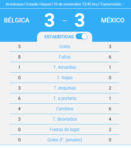 México empató 3-3 con Bélgica en partido amistoso disputado en el estadio Heysel, de Bruselas.Por los locales anotaron Hazard (16') y Lukaku en dos ocasiones (54' y 69'). El Tri igualó con un penalti cobrado por Guardado (38') y un doblete de Lozano (57' y 60').LEE: Minuto a minuto: Bélgica vs MéxicoAunque México intentó sorprender de inicio con un disparo desde afuera del área de Layún al minuto 4, los locales tomaron pronto el control del partido en el primer tiempo.El combinado belga defendía con una línea de cinco jugadores cuando replegaba, formando una muralla que México no logró franquear.Cuando los Diablos Rojos se lanzaban al frente era siempre con peligro. Hazard, la chispa de la ofensiva belga, incomodó a la zaga mexicana apareciendo por todas las zonas del ataque. El Tri, por el contrario, se mostró predecible y poco profundo en sus embates.La confirmación del dominio belga llegó al minuto 16, cuando Lukaku disparó a puerta por derecha para que Hazard anotara el primer tanto de la noche aprovechando el rechace al centro de Ochoa.Ante un rival que casi parecía aburrirse desactivando los predecibles ataques de la visita, la igualada para México llegó por la vía del penalti.Al 37 Ciman hizo un contacto sobre "Chicharito", que buscaba un centro por derecha de Lozano. El árbitro Mazzoleni decretó la pena máxima, que Guardado cobró con seguridad a la derecha del portero Courtois.Ya en la segunda parte, Bélgica parecía sentenciar el partido con un tanto de Lukaku al 54, pero los Diablos no contaban con la astucia de Hirving Lozano, que jugó un partido aparte. Con un par de acciones individuales el jugador del PSV igualó el marcador con tantos al 57' y al 60'.Lukaku anotó su segundo gol e igualó las cuentas al 69'. Con el empate, la tensión competitiva del partido decayó y el marcador no se movió, aunque Lozano se dio el lujo de fallar lo que pudo haber sido su tercer gol de la noche.México disputará su segundo amistoso de preparación en Europa el próximo lunes 13 de noviembre, cuando se medirá a Polonia en Gdansk a las 13:45, tiempo del centro de México. ALINEACIONESBÉLGICA: Courtois, Meunier, Ciman, Boyata, Vermaelen, Witsel, Tielemans (Dembélé, 45'), Chadli, De Bruyne (Mertens, 45'), E. Hazard (c) (T. hazard, 85'), R. Lukaku (Origi, 86'). DT: Roberto Martínez (ESP)MÉXICO: Ochoa, Araujo, Salcedo, Reyes (Álvarez, 58') (J. dos Santos, 88'), Layun, Lozano (Aquino, 90'), Vela (G. dos Santos), Hernandez (Jiménez, 50'), Moreno, Herrera, Guardado (c) (Damm, 68'). DT: Juan Carlos Osorio (COL)ÁRBITRO: Paolo Mazzoleni (ITA)