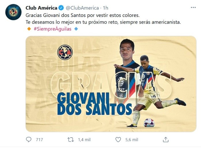 Giovani dos Santos no seguirá en el América. El club de Coapa dio a conocer que el futbolista dejará al equipo con un breve mensaje en sus redes sociales."Gracias Giovani dos Santos por vestir estos colores. Te deseamos lo mejor en tu próximo reto, siempre serás americanista", informó el club, acompañado de una imagen del atacante mexicano que fue campeón del mundo en 2005.Si bien el técnico azulcrema, Santiago Solari, se expresó de muy buena forma de Dos Santos a lo largo del torneo, la realidad es que tuvo una nula trascendencia en el semestre.En el reciente torneo Guardianes 2021, el futbolista de 32 años jugó únicamente en siete partidos, y sólo tres como titular con un total de 277 minutos disputados de 1530 posibles, sin contar la Liguilla. Sólo marcó un gol. El torneo anterior disputó nueve juegos, cinco como titular, y sólo jugó 399 minutos donde también marcó un gol.En julio de 2019 se anunció la llegada de Dos Santos como nuevo jugador azulcrema, proveniente del LA Galaxy, e inclusive se anunció que portaría la camiseta número "10". Sin embargo, hoy termina toda la gran expectativa que generó con su llegada. A lo largo de su estancia anotó cuatro goles.JM