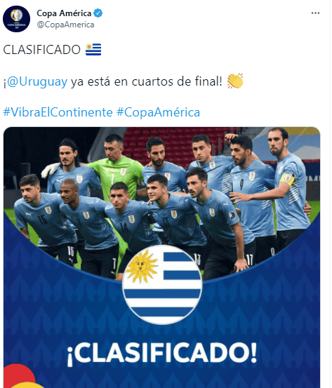 Uruguay ganó su primer partido en la edición 47 de la Copa América y se clasificó a los cuartos de final al vencer este jueves por 2-0 a Bolivia en la cuarta jornada del Grupo A, un encuentro disputado en el estadio Arena Pantanal de Cuiabá.El primer gol de la Celeste se originó de un boliviano. La mala fortuna acompañó al guardameta Carlos Lampe, quien marcó en el minuto 40 en propia meta cuando el defensa Jairo Quinteros intentó cortar un centro de Uruguay a ras de piso, pero el despeje golpeó en el portero de la Verde y entró al arco para el 1-0. El segundo gol de Uruguay llegó por intermedio de Edinson Cavani, su tanto número 52 con La Celeste, quien recibió en el minuto 79 una asistencia de Facundo Torres y remató con gran aplomo dentro del área para vencer a Lampe y poner el 2-0 en el marcador.De esta forma Uruguay acumula cuatro puntos y se ubica en la tercera posición, mientras que Bolivia se hunde en el fondo de la tabla sin puntos y con pocas opciones de avanzar a la siguiente fase.En la quinta y última fecha que se jugará el próximo lunes, Uruguay se enfrentará con Paraguay y Bolivia se medirá con Argentina. Descansará Chile. AJ