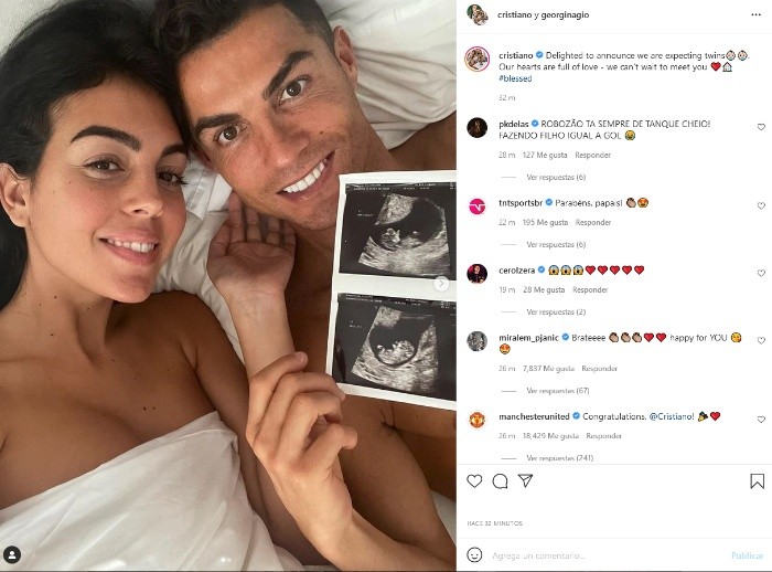 Cristiano Ronaldo y su pareja, Georgina Rodríguez, serán padres otra vez.Según una exclusiva de la revista Hola, el portugués y la modelo tendrían su segundo hijo y ella estaría ya en su semana 12 del embarazo. Más tarde, el futbolista confirmó la información, pero además informó que esperan gemelos."Encantado de anunciar que estamos esperando gemelos. Nuestros corazones están llenos de amor, no podemos esperar para conocerlos", escribió Cristiano Ronaldo en Instagram, junto a una fotografía donde se les ve mostrando la imagen de un eco.Este será el segundo embarazo en común de la pareja, pues en noviembre de 2017 recibieron a Alana Martina.En total, la familia de Cristiano Ronaldo (35 años) y Georgina Rodríguez (27) ya tendría por hijos a Cristiano Jr., los gemelos Eva y Mateo, Alana Martina, y los dos que están por llegar.Cristiano Ronaldo vivió hace un par de días una de las jornadas más complicados como jugador del Manchester United en su segunda etapa. El equipo perdió 5-0 ante el Liverpool, y el luso perdió la cabeza en una acción con Curtis Jones.Después, en sus redes sociales publicó una imagen suya con un mensaje de reflexión para los aficionados: "A veces, el resultado no es por el que luchamos. A veces el marcador no es el que queremos. Y esto es de nosotros, solo de nosotros, porque no hay nadie más a quien culpar. Nuestros fans fueron, una vez más, asombrosos en su constante apoyo. Se merecen algo mejor que esto, mucho mejor, y depende de nosotros cumplir. ¡El tiempo es ahora!".OF
