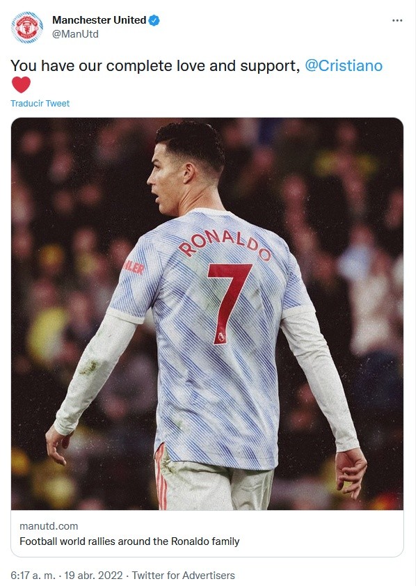 Este martes 19 de abril, Cristiano Ronaldo será baja para el partido Liverpool vs Manchester United de la Premier League, tras la muerte de uno de sus hijos gemelos recién nacidos, informó su equipo a través de un comunicado."La familia es más importante que todo, y Ronaldo está apoyando a sus seres queridos en este momento inmensamente difícil. Por tanto, podemos confirmar que no participará en el partido contra el Liverpool en Anfield este martes por la noche y subrayamos la petición de privacidad de su familia", dijo en su texto el Manchester United.En su mensaje, el equipo también dedicó un mensaje de apoyo al jugador, así a como a sus seres queridos: "Cristiano, todos pensamos en ti y mandamos fuerza a tu familia".El partido Liverpool vs Manchester United es este martes 19 de abril a las 14:00 horas tiempo del centro de México.Ayer, Cristiano Ronaldo publicó en sus redes sociales un comunicado en el que daba a conocer la muerte de uno de los gemelos que esperaba con la modelo Georgina Rodríguez."Con nuestra más profunda tristeza tenemos que anunciar el fallecimiento de nuestro hijo. Es el dolor más grande que unos padres pueden sentir. Solo el nacimiento de nuestra hija nos da la fuerza para vivir este momento con algo de esperanza y felicidad", indica el mensaje.Tras esto, usuarios de redes sociales se han cuestionado cuántos hijos tiene el delantero portugués, ex jugador del Real Madrid y la Juventus.El atacante de 36 años es padre de Cristiano Junior, además de los gemelos Eva y Mateo; con Georgina Rodríguez tuvo a Alana Martina, además de la niña que recién nació y de la que no se ha revelado su nombre.Ayer se volvió tendencia en redes sociales el nombre de Georgina Rodríguez, la pareja de Cristiano Ronaldo. Ella nació en Argentina en 1994, pero se mudó a España, de donde es originaria su madre, cuando tenía un año de edad, por lo que tiene ambas nacionalidades.Es modelo y empresaria, además, cuenta con un documental en la plataforma de streaming Netflix, en el que se cuentan las cuatro facetas más importantes de su vida como su familia, su religión, su influencia en las redes sociales, y su personalidad generosa.Actualmente, su cuenta de Instagram @georginagio tiene más de 37.3 millones de seguidores.Su relación con Cristiano Ronaldo habría comenzado en 2016, sin embargo, es oficial desde el año 2017.OF