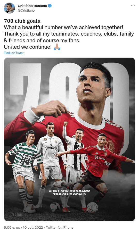 Cristiano Ronaldo, que ayer domingo alcanzó los 700 goles a nivel de clubes, agradeció el apoyo a los entrenadores, compañeros, familiares, clubes y amigos que le han acompañado durante su carrera deportiva.El portugués salió desde el banquillo, tras la lesión de Anthony Martial para hacer el tanto de la victoria del Manchester United contra el Everton. Este fue su primer tanto de la temporada en la Premier League, tras haber sido relegado al banquillo por el técnico, Erik Ten Hag.Las cifras de Cristiano se reparten entre los 450 goles que hizo en el Real Madrid, los 144 con el Manchester United, 101 con el Juventus de Turín y cinco con el Sporting de Portugal."Qué número más bonito hemos alcanzado todos juntos", dijo Cristiano en sus redes sociales, acompañando el texto de una foto que fusiona sus etapas en el Sporting, el Real Madrid, el Juventus y el Manchester United."Gracias a todos mis compañeros, entrenadores, clubes, familia y amigos, y por supuesto a los aficionados. Seguimos".OF