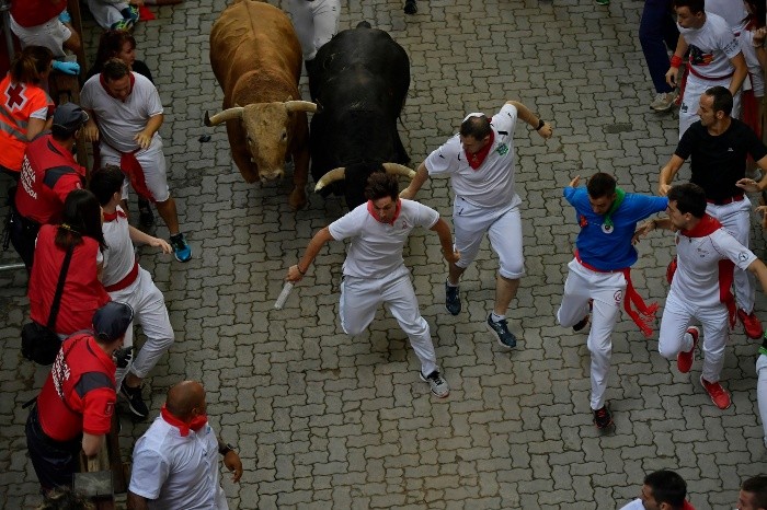 La ganadería de Fuente Ymbro protagonizó hoy el cuarto encierro de los sanfermines, el más rápido de este año y limpio de cornadas, en el que la caída de un toro en la Estafeta se ha quedado en un susto sin consecuencias.La manada ha corrido agrupada y a fuerte ritmo, para llegar a la plaza en dos minutos y 15 segundos, rodeados de una multitud de mozos que han acompañado su carrera, algunos de ellos tocando el lomo de los animales, pese a estar prohibido.Puntuales tras el cohete que marcaba las 8:00 horas locales (las 06:00 GMT) los toros han salido de los corrales de la ciudad de Pamplona encabezados por un manso que a los pocos metros se ha despistado apartándose hacia su izquierda, lo que ha dejado a dos de los toros a la cabeza del grupo unos segundos, ya que el cabestro ha retomado rápidamente su posición.A gran velocidad y compactos, los animales han hecho el recorrido de algo más de ochocientos metros hasta la plaza de toros rodeados de mozos que han sufrido caídas al no poder aguantarles el ritmo.A mitad de recorrido el toro de nombre "Hechizo" ha caído y ha arrollado con él a un grupo de mozos, lo que le ha hecho descolgarse unos metros de la manada y hacer en solitario este tramo.Con la misma limpieza que durante el recorrido, la manada ha atravesado la plaza de toros buscando la entrada de chiqueros, sin que los asistentes hayan tenido apenas que intervenir.