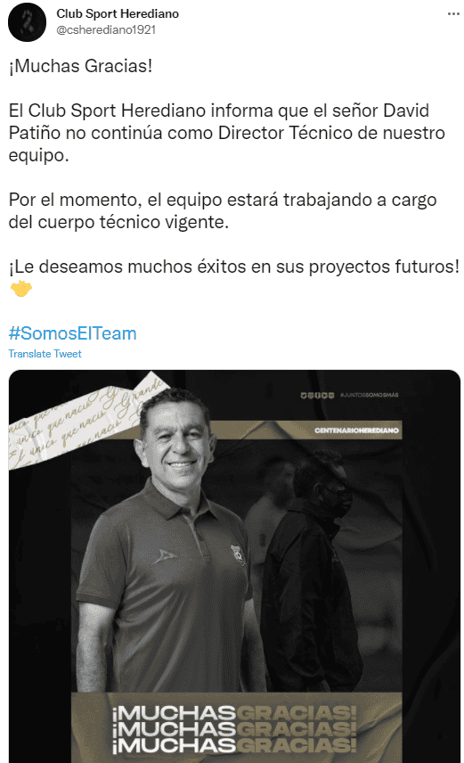 El Club Sport Herediano anunció que el técnico mexicano David Patiño dejó de dirigir al club.A través de sus redes sociales, el Herediano hizo público la destitución, "El Club Sport Herediano informa que el señor David Patiño no continúa como Director Técnico de nuestro equipo", se lee en el tweet. Patiño fue separado del club costarricense tras los resultados conseguidos. Herediano logró 12 puntos en nueve compromisos dirigidos por el mexicano, las cuatro victorias y las cinco derrotas los coloca en la octava posición de la tabla general de la primera división de Costa Rica.Jewison Bennette será quien por el momento se quede a cargo del equipo, ya que se mantiene el mismo cuerpo técnico que trabajaba con David Patiño.¿Quieres saber más?Si quieres tener más contenido, más imágenes y aún más noticias, entonces descarga INFORMAPlus, la aplicación digital de EL INFORMADOR, donde tenemos materiales exclusivos para ti. Descarga la aplicación y pruébala GRATIS por treinta días. Para iOS: https://apple.co/35jaVgbPara Android: https://bit.ly/3gwVSEV Si eres suscriptor de EL INFORMADOR tu acceso está incluido, solicítalo al 33 3678-7777 AA