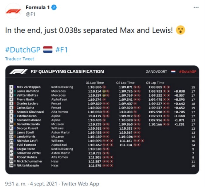 Este sábado, el mexicano Sergio ''Checo'' Pérez (Red Bull) no pasó de la primera ronda de la calificación (Q1) para el Gran Premio de Países Bajos, que este domingo 5 de septiembre se disputa en el circuito de Zandvoort.Tras sufrir problemas de tráfico, ''Checo'' Pérez fue eliminado en la Q1 junto al polaco Robert Kubica, que este sábado sustituyó en Alfa Romeo al finlandés Kimi Raikkonen, quien dio positivo a COVID-19, además de Sebastian Vettel (Aston Martin), Mick Schumacher y Nikita Mazepin (ambos de Haas).Charles Leclerc, de Ferrari, marcó el mejor tiempo de la ronda y terminó por delante de su compañero Carlos Sainz.El mexicano ''Checo'' Pérez saldrá así desde la decimosexta posición en la carrera que se correrá mañana a partir de las 08:00 horas tiempo del centro de México.El holandés Max Verstappen, compañero de ''Checo'' Pérez en Red Bull, saldrá primero este domingo en el GP de Países Bajos que se disputa en el circuito de Zandvoort.Verstappen, de 23 años, firmó la décima ''pole'' de su carrera en la F1 y la séptima del año, al registrar un tiempo de un minuto, ocho segundos y 885 milésimas, por delante del siete veces campeón del mundo el inglés Lewis Hamilton y el finlandés Valtteri Bottas, ambos de Mercedes.¿Quieres saber más?Si quieres tener más contenido, más imágenes y aún más noticias, entonces descarga INFORMAPlus, la aplicación digital de EL INFORMADOR, donde tenemos materiales exclusivos para ti.Descarga la aplicación y pruébala GRATIS por treinta días.Si eres suscriptor de EL INFORMADOR tu acceso está incluido, solicítalo al 33 3678-7777OF