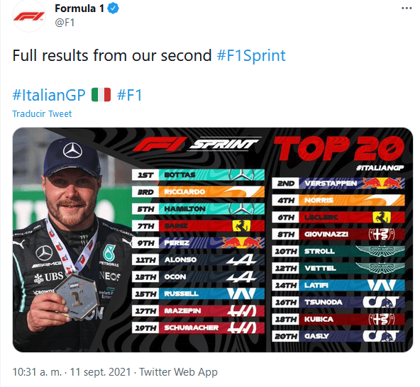 El piloto finlandés Valtteri Bottas (Mercedes) terminó como líder de la carrera sprint que definió la parrilla de salida del Gran Premio de Italia de Fórmula 1 (F1), pero no saldrá desde la ''pole'' el domingo en el Autódromo Nacional de Monza. El holandés Max Verstappen, de Red Bull, será quien arranque desde la primera posición, mientras que su compañero, el mexicano Sergio ''Checo'' Pérez logró clasificarse en el Top-10.Bottas saldrá desde el último lugar tras haber sido sancionado por cambiar el motor y otros elementos de su monoplaza, una situación que beneficia a Verstappen, actual líder del mundial de F1.El mexicano ''Checo'' Perez terminó en la novena posición, al registrar un tiempo de 1:20.611, pero saldrá desde la octava debido la sanción de Bottas.Entre los dos grandes aspirantes al título mundial (Verstappen había llegado a Monza con tres puntos de ventaja sobre Hamilton tras 13 pruebas disputadas de 22 programadas) se intercalaron los dos pilotos de McLaren, el australiano Daniel Ricciardo y el británico Lando Norris.Hamilton comenzó la carrera sprint, que tras Silverstone se vuelve a probar en Monza para definir la parrilla de salida, desde el segundo lugar, justo por detrás de Bottas, pero tuvo una mala salida y cayó a la quinta plaza, siendo adelantado por Verstappen y los McLaren, aunque saldrá del cuarto puesto.Con información de AFP¿Quieres saber más?Si quieres tener más contenido, más imágenes y aún más noticias, entonces descarga INFORMAPlus, la aplicación digital de EL INFORMADOR, donde tenemos materiales exclusivos para ti.Descarga la aplicación y pruébala GRATIS por treinta días.Si eres suscriptor de EL INFORMADOR tu acceso está incluido, solicítalo al 33 3678-7777OF