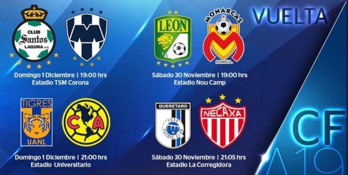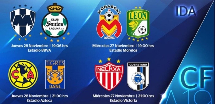 Este lunes la Liga MX ha definido los horarios de los cuartos de final del Apertura 2019, los cuales darán inicio el próximo 27 de noviembre. Morelia y León serán los encargados de abrir el telón de los duelos de ida el miércoles a las 19:00, mientras que un par de horas después, Necaxa recibirá al Querétaro. Para el jueves 28, los Rayados se medirán al líder Santos a las 19:06 horas y más tarde, las Águilas del América tratarán de hacer valer su localía ante los Tigres. Los partidos de vuelta comenzarán el sábado 30 de noviembre a las 19:00 horas con el León recibiendo a los michoacanos, mientras que ese mismo día, Gallos Blancos y Necaxa se enfrentarán en La Corregidora. Los duelos de vuelta se llevarán a cabo el domingo 1 de diciembre, primero con el Santos enfrentando a Rayados en La Comarca Lagunera a las 19:00 horas, mientras que Tigres vs América será el duelo estelar, cuando cierren la llave en el Estadio Universitario a las 21:00 horas. AJ