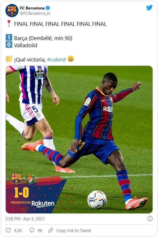 Con un solitario gol sobre la campana del francés Ousmane Dembélé, el Barcelona derrotó al Valladolid para colocarse a un solo punto del líder de LaLiga, Atlético de Madrid, este lunes en la 29ª jornada del campeonato español.No fue un buen encuentro del Barcelona, que sólo encontró la manera de romper la sólida defensa blanquivioleta en el minuto 90, cuando los vallisoletanos ya jugaban en inferioridad por la expulsión de Óscar Plano, que vio la roja directa por una dura entrada por detrás a Dembélé.Tras un centro desde la derecha del holandés Frenkie de Jong, el uruguayo Ronald Araújo, con la cabeza, dejó la pelota en el segundo palo para que Dembélé anotara de volea el tanto de decidió el partido.Con este resultado, el Barcelona suma 65 puntos y se coloca a uno del Atlético, que el domingo perdió en su visita al Sevilla.Tercero, a tres puntos del Atleti, está el Real Madrid, que el próximo domingo recibirá al Barça en el Clásico del futbol español, que puede resultar decisivo en la pelea por el título.En uno de sus peores partidos en las últimas semanas, el equipo que entrena Ronald Koeman pudo haber comenzado por debajo en el marcador, pero el cabezazo de Kenan Kodro se estrelló en el larquero del arco defendido por Marc André Ter Stegen.Sólo la expulsión de Plano agrietó el sistema defensivo del Valladolid, que aguantó hasta el último suspiro, pero que se fue de vacío de su visita al Camp Nou por el gol de Dembélé.JM