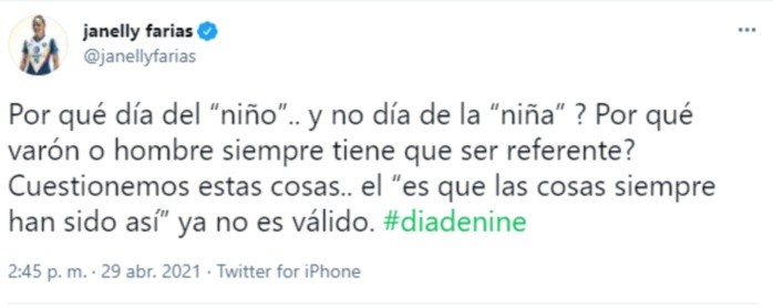 La defensora del América, Janelly Farías, volvió a alzar la voz en pro del feminismo. La jugadora de las Águilas cuestionó el por qué se considera "Día del niño y no de la niña"."¿Por qué día del 'niño' y no día de la 'niña'? ¿Por qué varón o hombre siempre tiene que ser referente? Cuestionemos estas cosas. Es que las cosas siempre han sido así", ya no es válido, escribió la futbolista en redes sociales.Su publicación dividió opiniones. Mientras unos respaldaban su idea, otra parte calificó como absurda su postura.Farías se ha caracterizado por manifestarse sobre este tipo de temas. Hace unas semanas, criticó fuertemente al defensor de los Tigres, Carlos Salcedo, quien criticó a los jugadores del América "por jugar como barbies".América, quien marcha octavo con cuatro puntos en la Liga MX Femenil, visitará el domingo a mediodía al Puebla.OF
