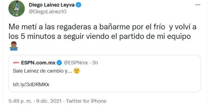 Diego Lainez no tomó de buena manera el ser sustituido del encuentro entre el Betis y el Celtic, en la sexta Jornada de la fase de grupos de la UEFA Europa League-El futbolista surgido de las Águilas del América fue titular, pero salió de cambio al minuto 63, situación que le causó mucha molestia.Su berrinche hizo que no diera la mano a nadie del banquillo del conjunto verdiblanco y que se dirigiera directo al vestuario.Estas imágenes se hicieron virales en redes sociales. El Betis cayó contra los escoceses 3-2, pero esta derrota no le afectó, ya que se mantuvieron como segundos de su grupo y lograron avanzar a la siguiente fase de la UEFA Europa League.A través de su cuenta de Twitter, Diego Lainez retuiteó una publicación de un medio deportivo de comunicación, aclarando los motivos por los cuales se dirigió al vestidor tras ser sustituido. "Me metí a las regaderas a bañarme por el frío y volví a los 5 minutos a seguir viendo el partido de mi equipo", escribió. Aunque el mexicano asegura que no fue un berrinche, queda la duda de por qué no le dio la mano a nadie a su paso. Con información de EL UNIVERSALJL