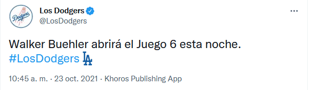 No terminan las malas noticias en Los Angeles Dodgers. A horas de que inicie el Juego 6 de la Serie de Campeonato frente a Atlanta Braves, los blanquiazules confirmaron que Walker Buehler será su pitcher abridor y no Max Scherzer como se tenía programado.El equipo angelino no tendrá en la apertura a su mejor lanzador por no recuperarse al 100 de su última salida, ocurrida el pasado domingo. En el segundo juego de la serie frente Atlanta Max Scherzer trabajó 4.1 entradas, tres días antes había cerrado el quinto encuentro ante San Francisco Giants.Scherzer declaró que sintió su "brazo muerto", luego de 79 lanzamientos en el Truist Park y ahora sigue sin fuerza para subir a la lomita en el duelo crucial por el boleto a la Serie Mundial.Esta ausencia se suma a la de Justin Turner, Max Muncy, Clayton Kershaw y Joe Kelly, quienes se perderán lo que resta de la postemporada por lesión.Por su parte, Walker Buehler tampoco ha tenido un descanso óptimo. El pitcher de Los Ángeles lanzó el martes el juego tres de la serie frente a Braves con seis días previos sin actividad. Hoy la responsabilidad de los Dodgers cargará en el diestro de 27 años.OF
