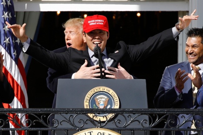 El presidente Donald Trump se apegó principalmente a los deportes e mientras honraba al campeón de la Serie Mundial, los Nationals de Washington, que hizo que un puñado de jugadores se saltaran la visita a la Casa Blanca.En medio de una investigación de juicio político sobre el Capitolio y Washington que celebran su primer campeón de las Grandes Ligas desde 1924, Trump abrazó a Kurt Suzuki luego de que el receptor se pusiera el sombrero "Make America Great Again". Trump recibió una camiseta de los Nacionales No. 45 del primera base Ryan Zimmerman, aplaudiendo el primer título del equipo y calificándolo como una "historia de regreso de todos los tiempos"."Todos se enamoraron del béisbol de los Nats", dijo Trump durante la ceremonia de media hora en el South Lawn a la que asistieron miles de fanáticos. "Eso es todo de lo que querían hablar: eso y juicio político. Me gusta más el beisbol de Nats".El relevista Sean Doolittle, quien junto con su esposa ha trabajado con refugiados sirios y veteranos militares y apoya los derechos de los homosexuales, no asistió al evento. También entre los que no figuran como asistentes estaban el candidato al JMV de la Liga Nacional Anthony Rendón, los jardineros Víctor Robles y Michael Taylor, y los lanzadores Joe Ross, Javy Guerra y Wander Suero y Wilmer Difo.El propietario principal, Mark Lerner, fue el único miembro del grupo de propietarios que figura como asistente.Dieciocho de los 25 jugadores en la lista de la Serie Mundial de Washington estuvieron presentes, incluido el MVP de la Serie Mundial Stephen Strasburg, quien optó por los últimos cuatro años de su contrato, pero podría volver a firmar un acuerdo más lucrativo. Los fanáticos corearon "¡Cuatro años más! Cuatro años más" a Davor de Strasburg.El gerente de Washington, Dave Martínez, cuyos padres son puertorriqueños, asistió e hizo algunas breves observaciones para deleite de los fanáticos y jugadores. Trump lo llamó una multitud récord y dijo: "Nunca hemos tenido tanta gente en el jardín delantero de la Casa Blanca". La Casa Blanca estimó una asistencia de cinco mil 300.LS