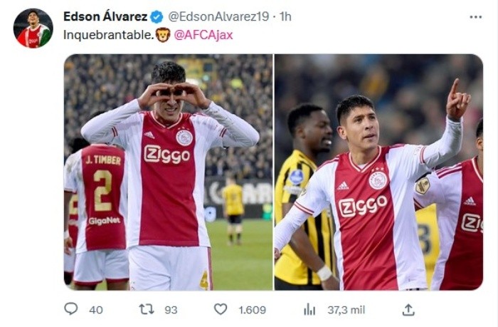 Edson Álvarez se ha convertido en uno de los actuales referentes del Ajax y este domingo anotó el gol con el que su equipo sacó la victoria ante el Vitesse.El defensor mexicano jugó los 90 minutos, metió un tanto y además recibió una amonestación.El cartón amarillo lo recibió a los 51 minutos y al 53', luego de un tiro de esquina, remató de cabeza para colocar el segundo del Ajax y poner el marcador 1-2.La victoria como visitante de este domingo deja al equipo de Ámsterdam como segundo de la Eredivisie con 49 puntos. Cabe recordar que el líder de la competencia es el Feyenoord donde milita Santiago Giménez, que tiene 52 unidades.Este ha sido un domingo positivo para algunos mexicanos que juegan en las Ligas de Europa.En Italia, Guillermo Ochoa volvió a ser titular y dejó su arco en cero tras la victoria 3-0 de la Salernitana ante el Monza.Además de Álvarez con el Ajax, el Feyenoord ganó 2-4 al Fortuna Sittard y en ese duelo Santiago Giménez anotó.JM