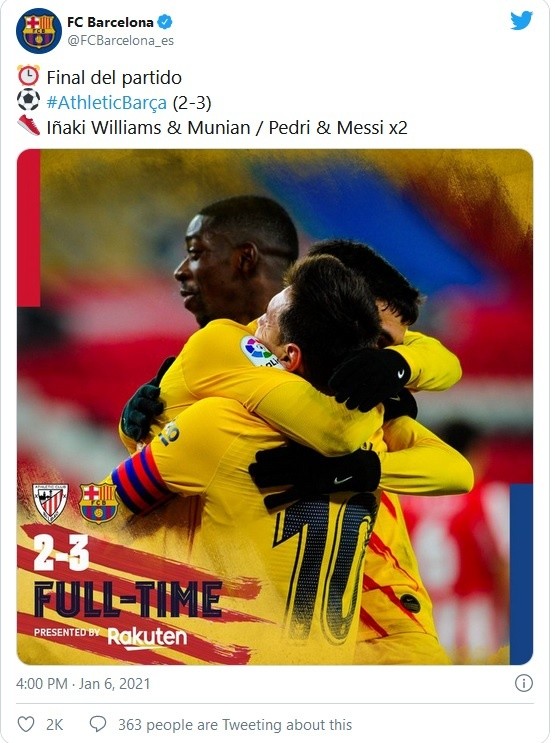 El FC Barcelona siguió escalando en la clasificación y se colocó tercero, entrando así en la zona de Liga de Campeones, tras vencer por 3-2 en su visita al Athletic de Bilbao, este miércoles en un partido que había sido aplazado en la segunda jornada de LaLiga española.El equipo vasco se adelantó en el 3 por medio de Iñaki Williams, pero los catalanes remontaron después gracias a Pedri González (14) y un doblete del argentino Lionel Messi (38, 62). Iker Muniain acortó para el Athletic, pero ya en el descuento final (90), sin tiempo para mucho más.El Barça había empezado el día en quinto puesto y los tres puntos le aúpan al tercero, ahora con 31 puntos, uno más que la Real Sociedad y dos más que el Villarreal.Respecto a los dos primeros, el Barcelona se aproxima a cinco puntos del Real Madrid y a siete del líder Atlético de Madrid.El equipo 'colchonero', que este miércoles fue eliminado en la Copa del Rey por el modesto Cornellà (Segunda División B), tiene eso sí dos partidos menos disputados que Real Madrid y Barcelona.El equipo azulgrana, muy irregular en la primera parte del curso, pudo encadenar una segunda victoria consecutiva y rompió además su mala racha en el nuevo estadio de San Mamés, donde había caído en sus dos visitantes anteriores, una en Liga y otra en la Copa del Rey.El Athletic queda noveno y no pudo tener una alegría en el estreno en el banquillo de su nuevo entrenador, Marcelino García Toral, recién nombrado tras la destitución de Gaizka Garitano el pasado fin de semana, justo después de un triunfo ante el Elche.JM