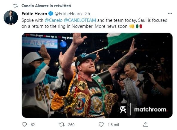 El boxeador Saúl "El Canelo" Álvarez no peleará en septiembre, como en otros años donde el mexicano se pone los guantes en el marco del 15 de septiembre.Según un Tweet publicado por Eddie Hearn, presidente de Matchroom y promotor del boxeador tapatío, "El Canelo" volverá al cuadrilatero hasta el próximo noviembre."Hoy hablé con Saúl y su equipo, Saul está enfocado en regresar al ring en noviembre. Más noticias pronto" escribió en su cuenta de Twitter.La última pelea del "Canelo" en el 2021 fue en mayo ante el británico Billy Joe Saunders. Previamente, en febrero del mismo año se enfrentó al turco Avni Yildirim, en ambas funciones la victoria fue para el mexicano.Si te interesó esta noticia y quieres saber más, entonces descarga y descubre INFORMAPlus, la aplicación digital de EL INFORMADOR, en donde tenemos contenidos exclusivos, seleccionados por nuestros editores, para darles una experiencia más completa a los lectores.Descarga la aplicación y pruébala GRATIS por treinta días.Para iOS: https://apple.co/35jaVgbPara Android: https://bit.ly/3gwVSEVSi eres suscriptor de EL INFORMADOR tu acceso está incluido, solicítalo al 33 3678-7777MB