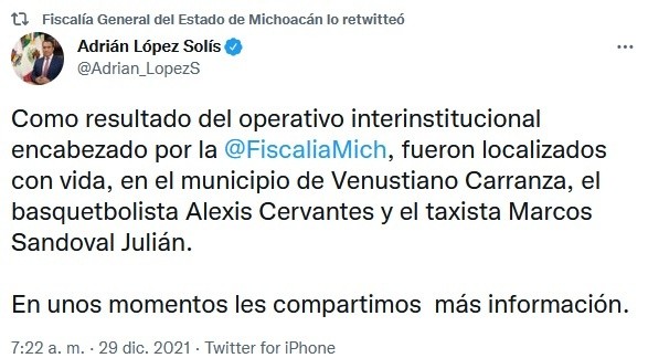La Fiscalía de Michoacán informó que la madrugada de este miércoles fueron localizados, con vida, el basquetbolista profesional Alexis Francisco Cervantes y el taxista Marcos Sandoval Julián reportados como desaparecidos el pasado 21 de diciembre.Alexis Cervantes, jugador de Libertadores de Querétaro, y Marcos Sandoval fueron encontrados en el municipio de Venustiano Carranza, Michoacán.De acuerdo al reporte, el jugador profesional y el conductor del taxi estaban amarrados a un árbol, sobre una brecha que comunica a la cabecera municipal con la población de San Pedro.Las víctimas fueron sacadas de ese lugar colindante con Jamay, Jalisco, en un operativo encabezado por personal de la Secretaría de Seguridad Pública del estado, Policía Municipal, FGE y Guardia Nacional.Francisco Alexis Cervantes Guerrero, jugador profesional de basquetbol y un taxista que lo transportaba, fueron reportados como desaparecidos en la zona limítrofe de Michoacán y Jalisco.Óscar Cervantes Guerrero, hermano del jugador del equipo Libertadores de Querétaro, contó que Alexis estuvo en Michoacán desde hace unas semanas para jugar un torneo.Explicó que al no haber liga mexicana, su hermano y otros atletas fueron contratados por promotores del deporte, para reforzar a otros equipos.Expuso, que en este caso, Alexis fue contratado para jugar en el municipio de Tancítaro, donde acabó su contrato el pasado lunes, por lo que el martes iba a regresar a su casa.Óscar Cervantes Guerrero narró que la alerta para él y su familia de que algo pasaba con Francisco Alexis, fue el 24 de diciembre. Platicó que Alexis les había dicho que regresaba a tiempo para pasar las fiestas decembrinas con su mamá y sus hermanos, pero no llegó.Óscar inició la búsqueda a distancia y fue que conoció los detalles previos a la desaparición de su hermano. Contó que su hermano Alexis abordó un autobús de pasajeros con destino a Guadalajara, Jalisco, de donde volaría a su tierra natal, Guasave, Sinaloa.Los planes del joven de 32 años de edad cambiaron, ya que el autobús tuvo que regresarse, por bloqueos carreteros y violencia en el municipio de Tangamandapio.Explicó que la decisión del deportista fue tomar un taxi para viajar de manera más segura y por ello abordó uno en la terminal de autobuses del municipio de Los Reyes.Los familiares refieren que el jugador y el chofer de nombre Marcos, se reportaron tuvieron la última comunicación cuando iban en el tramo Sahuayo-La Barca, a la altura de la comunidad de Jamay, Jalisco.Después, dijo Óscar Cervantes, nada se supo de ellos; no hay rastros, ni tampoco les han pedido algún rescate, como para que se pueda tratar de un secuestro.Refirió que la Fiscalía de Michoacán le informó que ya había iniciado de oficio una Carpeta de Investigación, por lo que no fue necesario presentar denuncia. Óscar pidió públicamente a quienes tenían a su hermano que lo dejaran en libertad y Alexis pudiera regresar a salvo con su familia.Aseguró que siempre ha sido una persona de bien, dedicada su vida entera al deporte y que nunca ha tenido problemas con nadie. "Desde la Universidad, el deporte profesional es lo único que ha hecho mi hermano; fue mundialista desde que estaba en el CEU (Centro de Estudios Universitarios) de Nuevo León".Francisco Alexis Cervantes Guerrero, es originario de Guasave, Sinaloa y previo a ser jugador de basquetbol, incursionó en el béisbol en ligas juveniles. Desde que Alexis fue mundialista en una competencia mundial de universidades en China, empezó a jugar en la Liga Nacional de Baloncesto Profesional de México (LNBP).Alexis Cervantes jugó en Las Abejas de León, en Correcaminos de Ciudad Victoria y en este momento es poste titular de Libertadores de Querétaro.OA