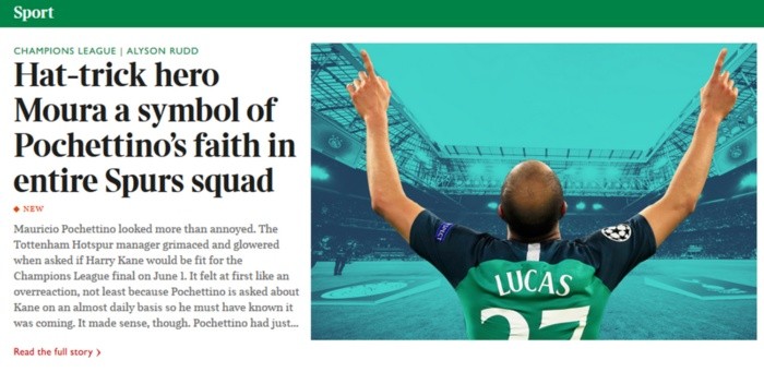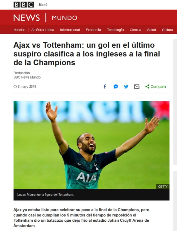 La prensa británica destaca este jueves la histórica remontada del Tottenham ante el Ajax, que le valió la clasificación para la final de la Liga de Campeones que disputará contra el Liverpool, el 1 de junio en el Wanda Metropolitano de Madrid.The Times apunta al "hat trick" de Lucas Moura como un "símbolo de fe de Pochettino en la plantilla al completo de los Spurs", que este miércoles logró remontar el 2-0 de la ida.The Guardian habla de una "era de remontadas notables de la Liga de Campeones", en alusión también a la victoria del Liverpool, que dará lugar a un duelo entre equipos ingleses y destaca que ambos equipos "se recuperaron de situaciones aparentemente imposibles para demostrar que, en Liga de Campeones, todo es posible".El Liverpool superó 4-0 al Barcelona el pasado martes y se aseguró así su puesto para la final en el Wanda Metropolitano.La BBC destaco la "dramática" reacción del equipo de Mauricio Pochettino y apunta a que la "inspiración del Liverpool" le sirvió para ganar su pase a la final.En la misma línea, Sky Sports abrió su edición con las declaraciones de Kieran Trippier, quien reveló que fueron las palabras del delantero Harry Kane las que "inspiraron" al equipo "durante el descanso" e hicieron posible la victoria.Kane, que se lesionó en la ida de cuartos de final ante el Manchester City y desde entonces ha permanecido fuera de los terrenos de juego por un problema en los ligamentos del tobillo, dejó ayer abierta la puerta a poder disputar la final.OF