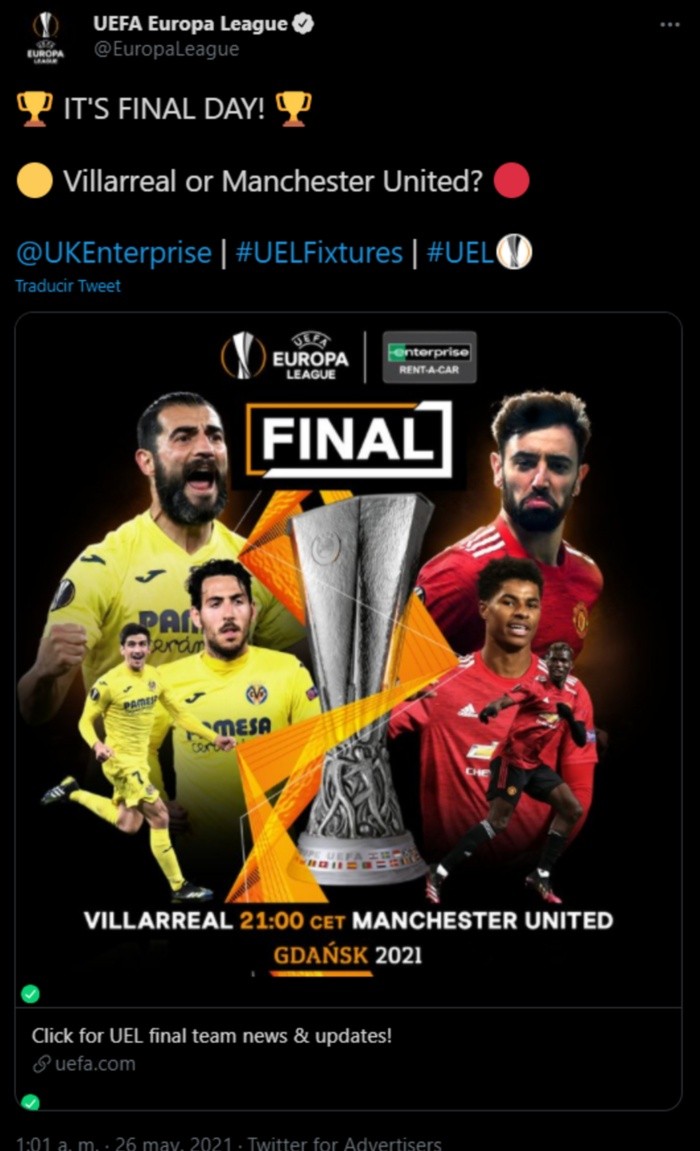 El Villarreal se enfrentará este miércoles en punto de las 14:00 horas (tiempo del centro de México) al Manchester United, en la final de la Europa League 2020-2021, partido en el que ambos equipos buscarán hacer historia. El Villarreal alcanzó la primera final continental de su historia, por lo que quiere dejar marca ante otro equipo que presume el título de Europa League que ganó en 2017, así como tres más de la Champions.El técnico del Villarreal, Unai Emery, un especialista de la Europa League con sus tres títulos que ganó con el Sevilla, busca agrandar un poco más su leyenda, esta vez ante el Manchester United en su quinta final.El técnico del Manchester United, Ole Gunnar Solskjaer, cree que ganar el título será un ''gran trampolín hacia el futuro''. En la temporada que acaba de terminar, el equipo, cuyo último gran título fue la Europa League de 2017, acabó como sublíder de la Premier LeagueEl partido podrá ser visto en televisión de paga, pero también podrás conocer los resultados a través de EL INFORMADOR.OF