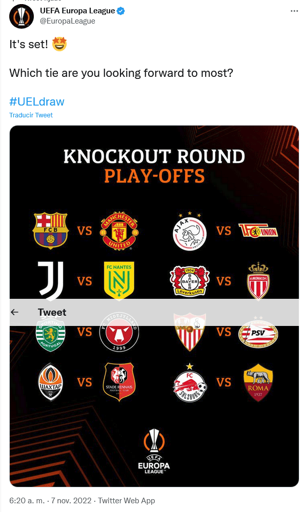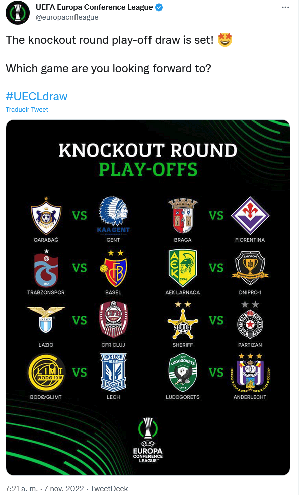 De acuerdo con el calendario de la UEFA, se tiene contemplado que los encuentros de la segunda fase de dieciseisavos de final de la Europa League y Europa Conference League se jueguen los días 16 de febrero la ida, mientras que la vuelta será el día 23.