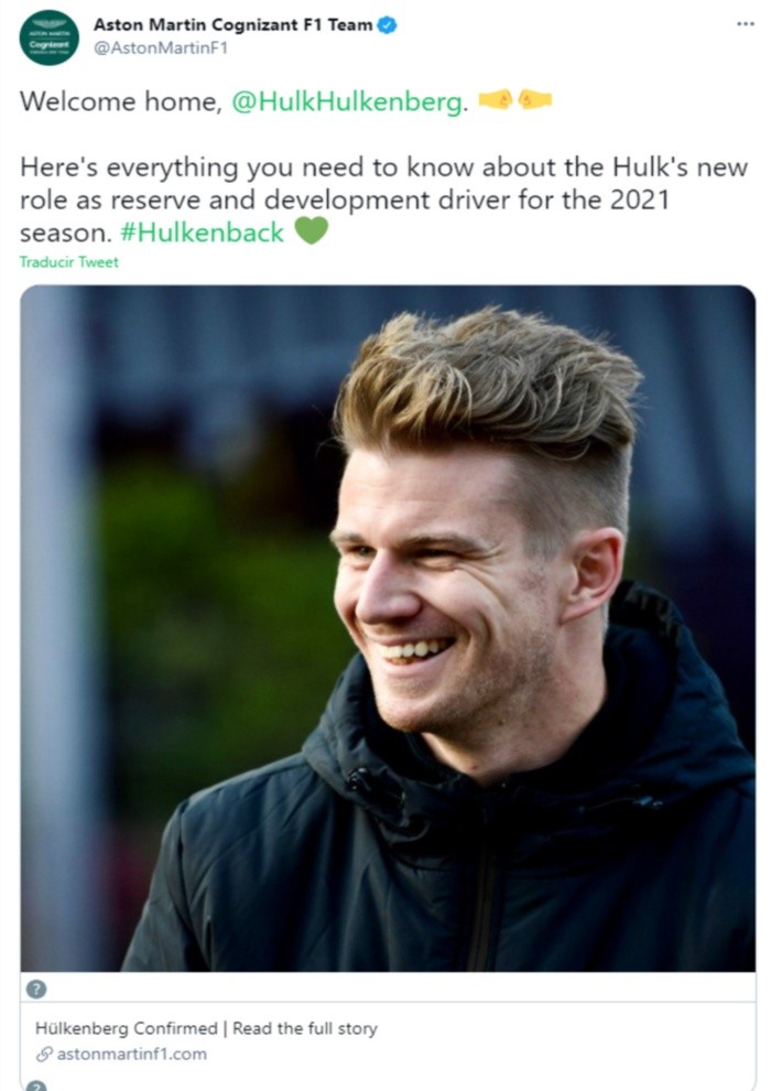 El alemán Nico Hülkenberg, de 33 años, antiguo piloto Renault, y ex compañero del mexicano Sergio ''Checo'' Pérez en Force India, será piloto reserva y de desarrollo de Aston Martin esta temporada, anunció este jueves la escudería de F1.Hülkenberg, que ha tomado la salida en 176 grandes premios, no tenía equipo desde su marcha de Renault a finales de 2019.En 2020, el alemán ya había tomado parte en tres grandes premios para Racing Point (antiguo nombre de Aston Martin), en sustitución de los pilotos ''Checo'' Pérez y después Lance Stroll, positivos al COVID-19.Hülkenberg será también un piloto de reserva no oficial para Mercedes este año. La escudería siete veces campeona del mundo podría contar con el alemán en varias ocasiones este año cuando sus pilotos de reserva Stoffel Vandoorne y Nyck de Vries serán utilizados en Fórmula E por Mercedes.El ex piloto Renault (2017-2019), que también conoció Williams, Sauber y Force India (antiguo nombre de Racing Point), terminó en séptima posición del campeonato del mundo en 2018, su mejor posición.OF