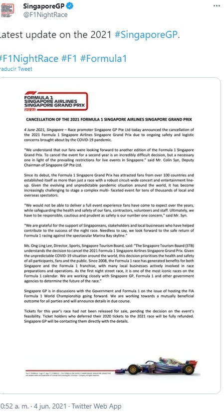 El Gran Premio de Singapur de Fórmula 1, previsto para el 3 de octubre, quedó cancelado "por problemas de seguridad y de logística generados por la pandemia del COVID-19", anunció el promotor de la carrera este viernes."Cancelar el evento por segundo año consecutivo es una decisión increíblemente difícil, pero necesaria teniendo en cuenta las restricciones que hay sobre los eventos organizados en Singapur", explicó Colin Syn, presidente adjunto del promotor del Gran Premio, en un comunicado."No estaríamos con la capacidad de brindar a los espectadores la experiencia que esperan respecto a los últimos años preservando su salud y su seguridad", añadió Syn.Poco antes de ese anuncio, un vocero del promotor del Mundial de F1, había indicado que continuaban "trabajando con todos los promotores (de Gran Premios) durante este periodo incierto" con la intención de "adaptarse si fuera necesario".Turquía (Estambul) y China (Shanghai), que han visto aplazados 'sine die' sus Grandes Premios de esta temporada, podrían reemplazar a Singapur. Estados Unidos podría acoger una segunda carrera para ocupar ese hueco del calendario.No es la única incertidumbre en el calendario de la segunda parte de la temporada de la Fórmula 1. Según las normas actuales, viajar a Brasil (7 noviembre), Turquía o Abu Dabi (12 diciembre) impondría una cuarentena a su regreso a la mayoría del personal de la Fórmula 1.Australia (21 noviembre) también se muestra prudente en lo referente a la apertura de fronteras.La sexta prueba de la temporada, de un calendario de 23, se disputa esta semana, de viernes a domingo, en Azerbaiyán.OF
