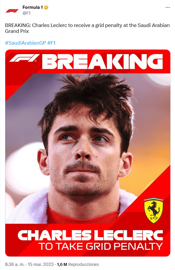 ¡Castigado! El piloto de la escudería Ferrari, Charles Leclerc, fue sancionado este miércoles, según informó la Fórmula 1 (F1), después de que se detectara una anomalía en los controles electrónicos de la unidad de potencia de su vehículo en el Gran Premio de Bahrein, los cuales fueron sustituidos.En la carrera, el piloto monegasco abandonó con una pérdida de potencia, y poco después se supo que los controles electrónicos fueron la razón por la que protagonizó el primer retiro para la escudería italiana en la temporada de F1 2023.El director de Ferrari, Fred Vasseur, confirmó que la unidad de controles electrónicos volverá a ser cambiada, por lo que Leclerc recibirá su primera penalización de 10 puestos en la parrilla de salida para el Gran Premio de Arabia Saudita, el cual se corre este fin de semana.Luego de que se corriera la primera carrera de la temporada de la F1 2023, el Gran Premio de Bahrein, en la que el vencedor fue el bicampeón del mundo Max Verstappen, Charles Leclerc, que abandonó la competencia, se ubicó en el lugar 19 de la clasificación de pilotos, por lo que será importante lo que pueda hacer pese a la sanción este domingo.OF