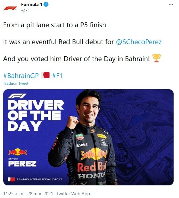 En su primer Gran Premio de Fórmula 1 con Red Bull, el mexicano Sergio "Checo" Pérez fue elegido como el piloto del día en Baréin por parte de la afición.Aunque el piloto de Guadalajara terminó en la quinta posición, destacó por la remontada tras arrancar en última posición debido a un problema del auto de Red Bull. "Checo" Pérez se mostró contento después de haber conseguido el quinto sitio durante el Gran Premio de Baréin de la Fórmula Uno."Checo" presentó problemas con el monoplaza de Red Bull. En los momentos antes de la carrera los ingenieros tuvieron que hacer cambios en la batería del RB16B que, después, durante la vuelta de formación se apagó y perdió potencia y estuvo cerca de obligar al abandono del tapatío."En la carrera de formación todo se apagó, estuve cerca de salirme del auto. Volví a intentar y después, realmente pasó un milagro, pude volver a prender el motor. Tuvimos que iniciar desde el pitlane, eso no fue ideal, pero al final logramos recuperarnos".Pérez calificó al Gran Premio de Baréin como positivo porque le dio oportunidad de tener un mayor conocimiento de su auto."Hay muchas cosas positivas, estoy muy contento de que sí pude hacer la carrera y de tener esos kilómetros, es muy importante y estoy muy feliz con eso".El tapatío agregó que el Gran Premio "fue divertido, tuvimos un buen ritmo y fue divertido y nos recuperamos y logramos sacar puntos para el equipo".La próxima parada de la Fórmula Uno será el próximo 18 de abril en el Autódromo Enzo e Dino Ferrari en Imola, Italia.IM