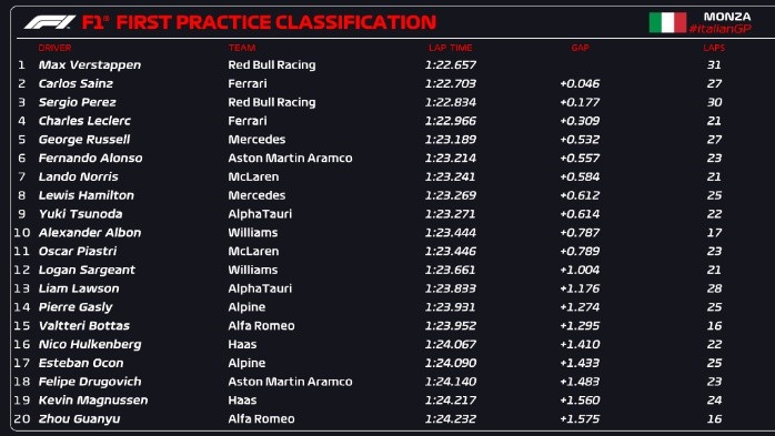 El piloto neerlandés de Red Bull, Max Verstappen, fue el más rápido, por delante de Carlos Sainz (Ferrari) y del mexicano Sergio "Checo" Pérez, en el primer ensayo libre para el Gran Premio de Italia 2023 de Fórmula 1 (F1), que se disputa este domingo en el circuito de Monza.Verstappen, cada vez más cerca de su tercer título de campeón consecutivo, cubrió, en la mejor de sus 31 vueltas, los 5 mil 793 metros de la mítica pista lombarda en un minuto, 22 segundos y 657 milésimas, sólo 46 menos que Sainz, y con 177 de ventaja sobre su compañero, el mexicano Checo Pérez, que marcó el tercer tiempo de la sesión; al igual que los anteriores, con el neumático duro.Checo Pérez dio 30 vueltas y marcó el tercer crono de un entrenamiento que acabó con 25 grados centígrados ambientales y en el que nadie quiso gastar demasiada "goma", en un Gran Premio de F1 "experimental" -con la misma idea que el de Hungría-, con limitación de juegos de neumáticos y obligatoriedad de compuestos en cada ronda de la calificación; en aras a una mayor sostenibilidad.OF