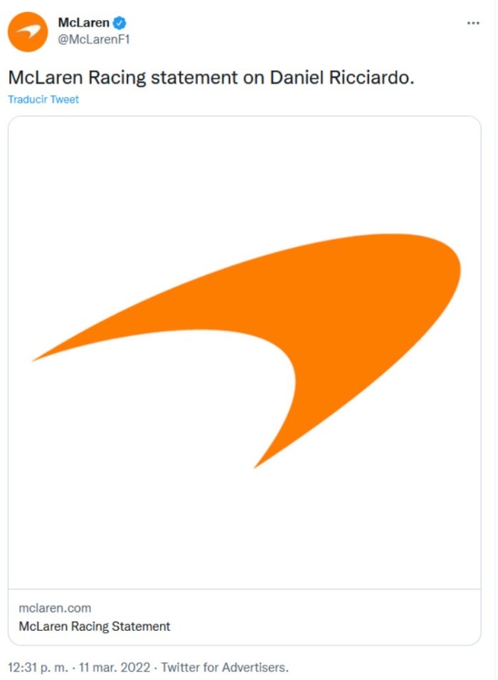 Este viernes 11 de marzo se dio a conocer que un piloto de la Fórmula 1 (F1) dio positivo a COVID-19 en una prueba PCR que le fue realizada. El Mundial 2022 arranca la próxima semana, y mañana se corren los últimos entrenamientos de pretemporada.Se trata del australiano Daniel Ricciardo, quien de acuerdo con su equipo, McLaren, se sentía mal desde el pasado miércoles.Ricciardo, con ocho victorias y 31 podios a lo largo de su carrera en la F1, será aislado de acuerdo con las regulaciones locales, informó la escudería en un comunicado."Según esta normativa, Daniel será dado de alta a tiempo para el Gran Premio de Baréin de Fórmula Uno del próximo fin de semana. Daniel ya empieza a sentirse mejor y le deseamos una rápida recuperación", dice el texto.Tras la baja de Daniel Ricciardo, será el británico Lando Norris quien conducirá el MCL36 para el último día de la prueba de la pretemporada que se correrá mañana sábado 12 de marzo en el Circuito Internacional de Baréin.OF