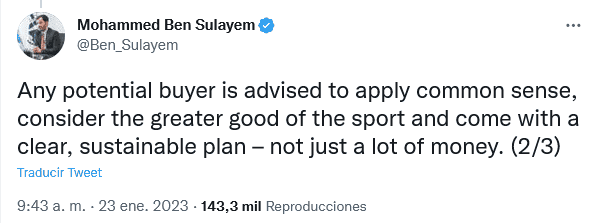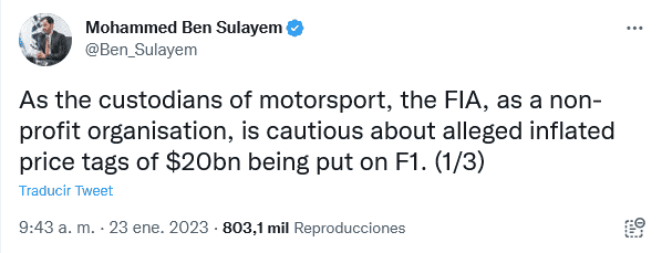 El presidente de la Federación Internacional de Automovilismo (FIA), Ben Sulayem, ha sido acusado por los dueños de la Fórmula Uno de interferir de los derechos comerciales de la categoría.Luego de que Mohammed Ben Sulayen asegurara que "la FIA, como organización sin ánimo de lucro, se muestra cautelosa ante los supuestos precios inflados de 20 mil millones de dólares que se están poniendo a la F1" tras un reporte del medio Bloomberg que afirma que un conglomerado saudí habría presentado una oferta de compra de 20 mil millones de dólares por la F1.Además, el presidente de la FIA agregó que aconseja "a cualquier comprador potencial que aplique el sentido común, tenga en cuenta el bien mayor del deporte y presente un plan claro y sostenible, no sólo un montón de dinero".Ante estas declaraciones, el grupo de Liberty Media, dueño actual de la Fórmula Uno, envió una carta a Ben Sulayem en el que expresó su preocupación por la forma en que las declaraciones se metieron en los derechos comerciales de la organización.Según medios especializados, en el texto enviado por parte de Liberty Media recordaban que la carta citaba lo siguiente: "La FIA se comprometió inequívocamente a no hacer nada que perjudique la propiedad, gestión y/o explotación de los derechos comerciales" y que consideran que "los comentarios hechos desde la cuenta oficial del presidente de la FIA en redes sociales interfieren con esos derechos de manera inaceptable".OF