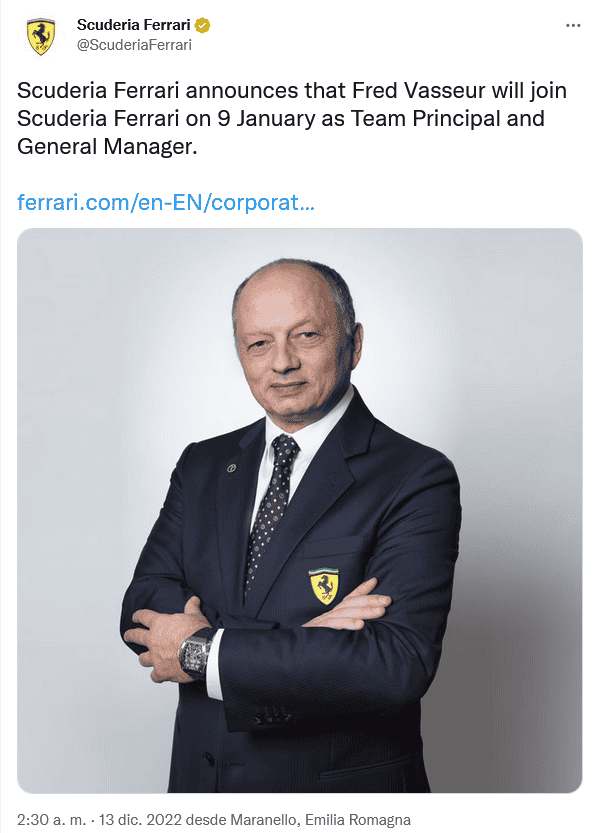 El francés Frederic 'Fred' Vasseur será en nuevo director deportivo de Ferrari desde el 1 de enero de 2023, en sustitución del italiano Mattia Binotto, que renunció el mes pasado, según ha confirmado la escudería italiana.Vasseur deja el equipo Alfa Romeo, que emitió también un comunicado haciendo pública la salida del francés tras seis años y llevar a sus coches al sexto lugar en el campeonato de constructores esta temporada, el mejor resultado del equipo en una década.Vasseur tiene más de dos décadas de experiencia en el mundo del automovilismo, incluido un periodo como jefe de equipo en Renault durante la campaña de 2016 de la Fórmula 1 (F1).El nuevo director deportivo de Ferrari tiene 54 años y es ingeniero aeronáutico."Estoy honrado por asumir el liderazgo de la Scuderia Ferrari como director del equipo. Ferrari siempre ha representado la cúspide del mundo de las carreras para mí. Espero trabajar con el equipo de Maranello para honrar la historia y el legado de la Scuderia y cumplir con nuestros 'tifosi' en todo el mundo", dijo Vasseur.OF