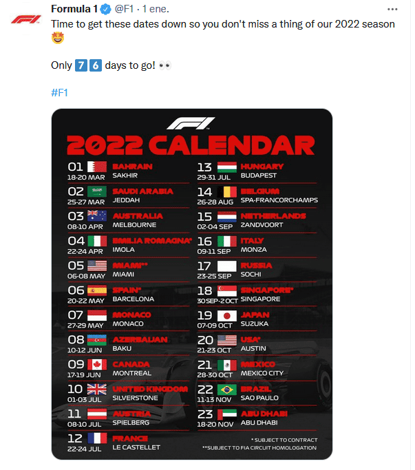 Este lunes, la Fórmula 1 (F1) publicó el calendario de la temporada 2022, que incluye 23 carreras.A través de sus redes sociales, la F1 publicó el programa de los grandes premios que se correrán en el año que está por iniciar, y que según lo planeado, será el más largo hasta ahora, pues incluirá por primera vez una carrera en Miami.Los Grandes Premios de Australia, Canadá, Singapur y Japón volverán al calendario de la F1 este 2022. Las competencias fueron canceladas en 2020 o 2021 debido a la pandemia de COVID-19, pero se espera que este año se regrese a la programación tradicional.De acuerdo con el calendario publicado por la F1, se espera que el GP de México se lleve a cabo el último fin de semana de octubre, es decir, el domingo 30, en el Autódromo Hermanos Rodríguez. Solo en 2021 la carrera se realizó una semana después, el domingo 7 de noviembre.1- GP de Baréin (Sakhir), 18-20 de marzo 2-GP de Arabia Saudita (Yeddah), 25-27 marzo 3- Australia (Melbourne), 8-10 abril 4- Emilia Romaña (Imola)*, 22-24 abril 5- Miami (Miami)**, 6-8 mayo 6- España (Barcelona)*, 20-22 mayo 7- Mónaco (Mónaco). 27-29 mayo 8- Azerbaiyán (Bakú), 10-12 junio 9- Canadá (Montreal), 17-19 junio 10- Reino unido (Silverstone), 1-3 julio 11- Austria (Spielberg), 8-10 julio 12- Francia (Le Castellet), 22-24 julio 13- Hungría (Budapest), 29-31 julio 14- Bélgica (Spa-Francorchamps), 26-28 agosto 15- Países Bajos (Zandvoort), 2-4 septiembre 16- Italia (Monza), 9-11 septiembre 17- Rusia (Sochi), 23-8 septiembre 18- Singapur (Singapur)*, 30 septiembre-2 octubre 19- Japón (Suzuka), 7-9 octubre 20- Estados Unidos (Austin)*, 21-23 octubre 21- México (Ciudad de México), 28-30 octubre 22- Brasil (Sao Paulo), 11-13 noviembre 23- Abu Dhabi (Abu Dhabi),18-20 noviembre* Sujeto a contrato ** Sujeto a homologación de la FIAOF