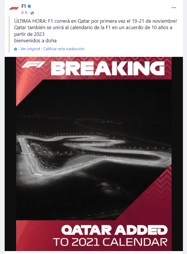Qatar organizará una carrera de la Fórmula Uno (F1) por primera vez el próximo mes de noviembre y durante 10 años, pero a partir de 2023.La nación del golfo Pérsico se queda con la plaza que faltaba para llenar en el reconfigurado calendario del Mundial de F1 2021. El Gran Premio (GP) de Qatar se disputará en horario nocturno, el próximo 21 de noviembre en el Circuito Internacional de Losail.Como la vigésima de las 22 carreras esta temporada, Qatar quedó previo a la primera edición del GP de Arabia Saudita en Yedah el 5 de diciembre, y el GP de Abu Dabi, que bajará el telón el 12 de diciembre."Qatar tenía mucha disposición de ayudar a la F1 y, como parte de ese proceso, se habló y aprobó tener un acuerdo más amplio", dijo la F1 en un comunicado. "La visión de la F1 como escaparate de Qatar tras la Copa Mundial (de futbol) en 2022) fue el elemento motivador".La carrera se disputará exactamente un año previo al arranque del Mundial 2022, el 21 de noviembre en Al Khor, a unos 50 kilómetros (30 millas) al norte de Doha. Será otro evento global en Qatar tras el mundial de atletismo en Doha hace dos años.El GP de Qatar no se correrá el próximo año debido al Mundial de Futbol 2022, por lo que el acuerdo de una década entrará en vigencia a partir del año siguiente.El circuito de 5.4 kilómetros, con aforo para ocho mil espectadores, se encuentra al norte de Doha y ha sido escenario de la MotoGP desde 2004.No quedó claro si Losail continuará como sede de la F1 desde 2023, ya que el circuito necesitará ser modificado, así que existe una fuerte posibilidad de otro sitio. La F1 se limitó a decir que es un asunto que se está debatiendo.La cancelación del GP de Japón, que debía disputarse el 10 de octubre, por las restricciones relacionadas con la pandemia de coronavirus, provocó los cambios en el calendario.El GP de Turquía, originalmente pautado para el 3 de octubre, tomó la plaza de Japón.Aunque el GP de Estados Unidos se mantuvo fijo para el 24 de octubre, el GP de México pasó del 31 de octubre al 7 de noviembre y Brasil cambió de esa fecha al 14 de noviembre."Hemos demostrado que podemos adaptarnos y hay mucho interés en nuestro deporte, y la esperanza de muchos lugares en tener un Gran Premio", dijo el presidente de la F1 Stefano Domenicali. "La F1 y la FIA han hecho posible que el calendario de 22 carreras sea posible, algo que es muy impresionante en un año tan difícil".¿Quieres saber más?Si quieres tener más contenido, más imágenes y aún más noticias, entonces descarga INFORMAPlus, la aplicación digital de EL INFORMADOR, donde tenemos materiales exclusivos para ti.Descarga la aplicación y pruébala GRATIS por treinta días.Si eres suscriptor de EL INFORMADOR tu acceso está incluido, solicítalo al 33 3678-7777OF