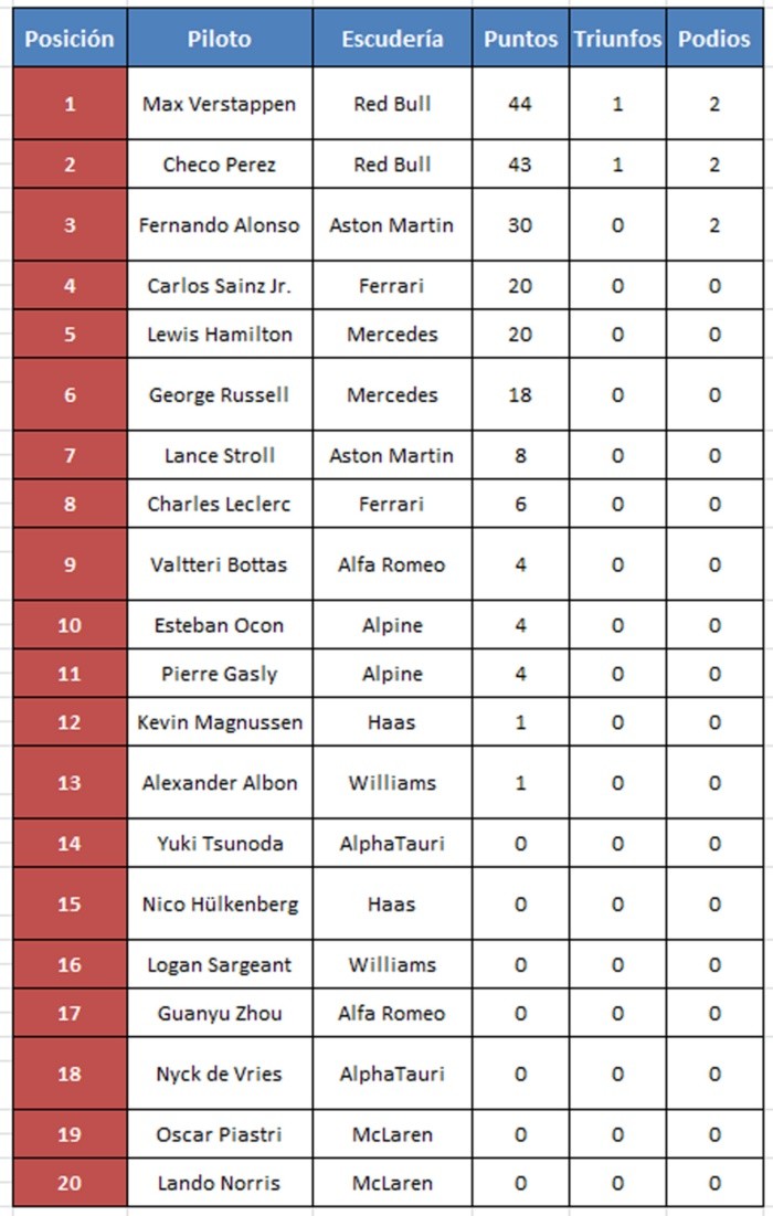 Luego de que corriera la segunda carrera de la temporada 2023 de la Fórmula 1 (F1), el Gran Premio de Arabia Saudita, en la que el vencedor fue el mexicano Sergio "Checo" Pérez, así quedaron las clasificaciones (standings) tanto en pilotos como en constructores.El neerlandés de Red Bull, Verstappen, se mantiene a la cabeza con 44 puntos; por su parte, Checo Pérez es segundo, con 43 unidades; mientras que el español de Aston Martin, Fernando Alonso, inició como en los viejos tiempos y es tercero de la clasificación con 30; el Top-5 lo cierran Carlos Sainz de Ferrari y el múltiple campeón Lewis Hamilton, ambos con 20.En la clasificación de constructores, Red Bull se colocó a la cabeza con 87 puntos; mientras que el Top-3 lo completan Aston Martin con 38 y Mercedes, ambos con 38 unidades.La próxima carrera de la F1 será la del Gran Premio de Australia el próximo fin de semana.OF