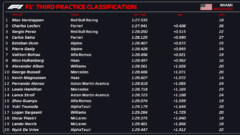 El neerlandés Max Verstappen (Red Bull), líder del campeonato de Fórmula 1 (F1) y que aspira a lograr un tercer título seguido, volvió a ser el más rápido este sábado en el tercer y último entrenamiento libre para el Gran Premio de Miami 2023, el quinto del Mundial, que se disputa en el circuito construido en torno al Hard Rock Stadion de esa localidad del estado de Florida.En su mejor vuelta, Verstappen cubrió los 5.412 kilómetros de la calurosa pista construida alrededor del estadio de los Miami Dolphins -equipo de la NFL, la liga profesional de futbol americano- en un minuto, 27 segundos y 535 milésimas, 406 menos que el monegasco Charles Leclerc (Ferrari).El mexicano Sergio "Checo" Pérez terminó en la tercera posición, con un registro de 1 minuto, 28 segundos y 050 centésimas.OF