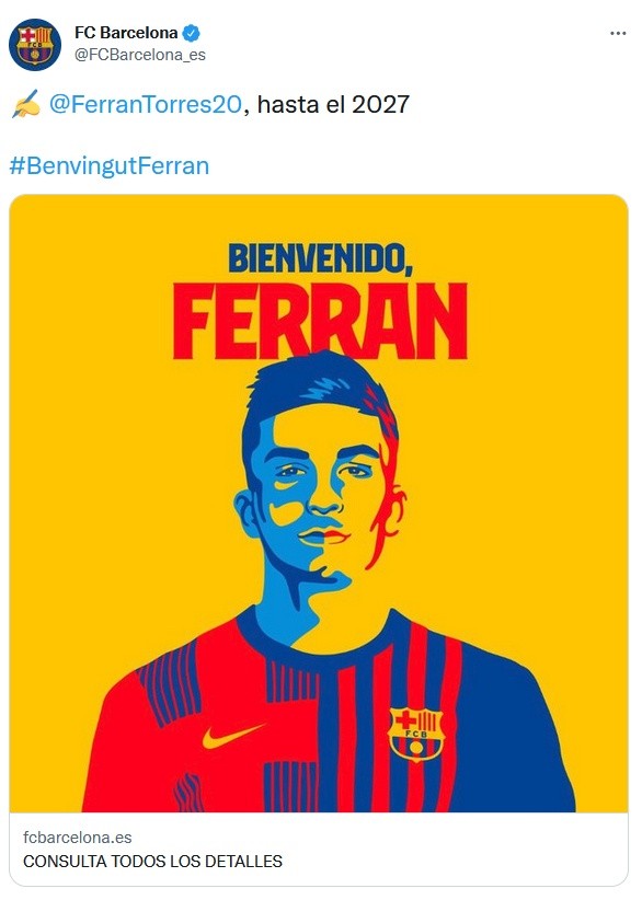 El delantero español Ferrán Torres deja el Manchester City para comprometerse con el FC Barcelona. El equipo catalán informó que se firmó un contrato de cinco años con el que se convierte en el primer gran fichaje en la era de Xavi Hernández."El FC Barcelona ha llegado a un acuerdo con el Manchester City para el traspaso de Ferrán Torres. El jugador ha firmado contrato con el club para las próximas 5 temporadas, hasta el 30 de junio de 2027, con una cláusula de rescisión de mil millones de euros" (mil 132 millones de dólares), informó el Barça en un comunicado en su página de Internet.El Barça informa que Ferrán Torres será presentado el lunes 3 de enero en el Estadio Camp Nou.El monto del traspaso no fue revelado, pero la prensa británica había señalado el pasado 22 de diciembre que se haría por un monto de 55 millones de euros (62.2 millones de dólares).El fichaje de Ferrán Torres lleva al Barça a uno de los más prometedores futbolistas españoles y da a Xavi Hernández un delantero que puede jugar en cualquier posición de ataque y que marca goles, una necesidad acuciante después de que la partida de Lionel Messi dejara al club sin sus docenas de anotaciones anuales.Torres había llegado desde el Valencia al Manchester City en agosto de 2020 por 20 millones de euros (22.6 millones de dólares).Ferrán Torres, de 21 años, se formó en la cantera del Valencia, en cuyo primer equipo jugó tres temporadas (2017-2020) antes de fichar por el club inglés entrenado por Josep Guardiola.Torres llega a un Barça que ocupa solo la séptima posición en la LaLiga de España, y que fue eliminado en la fase de grupos de la actual Champions League, habiendo marcado solo dos goles en seis partidos.En contraste, Torres marcó 16 goles en poco más de una temporada en el Manchester City (en este curso solo jugó hasta octubre, cuando se fracturó el pie).Ferrán Torres es un jugador importante en el proyecto de renovación de la Selección de España, y ha disputado ya 22 partidos con La Roja, en los que anotó 12 goles, tres de ellos ante Alemania en el partido de la Liga de las Naciones que España ganó 6-0 en noviembre de 2020.Con unas finanzas muy maltrechas, que han hundido el límite que puede pagar en salarios según los criterios de LaLiga, el Barça tendrá que desprenderse rápidamente de jugadores para poder inscribir a Torres.Según el diario deportivo AS, el Barça intentará traspasar a hasta cinco jugadores en el mercado de invierno, entre los cuales destacan el volante brasileño Philippe Coutinho y al defensa francés Samuel Umtiti.Ambos jugadores, Coutinho y Umtiti, apenas han jugado en las últimas dos temporadas y cuentan con dos de los salarios más altos de la plantilla.Después de que quedara fuera en la Champions League, el Barça no recibirá los 9.6 millones de euros (10.8 millones de dólares) que corresponden a los clubes que clasifican a los octavos de final, ni los 10.6 millones de euros (12 millones de dólares) que corresponden a los clasificados para los cuartos de final, un dinero que había sido incluido en sus presupuestos para la temporada actual.El equipo ya tiene una deuda de más de mil millones de euros y cerró el ejercicio 2020-2021 con unas pérdidas de 481 millones de euros (544 millones de dólares).Además, el Barça acaba de poner en marcha su proyecto de renovación del Camp Nou, conocido como "Espai Barça", para el que se dispone a endeudarse en mil 500 millones de euros (mil 698 millones de dólares) con el banco Goldman Sachs, según la prensa catalana, en un préstamo que se devolverá en 35 años.OF