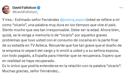 David Faitelson se defendió ayer en su perfil en redes sociales tras una dura crítica de José Ramón Fernández, revelando que su exjefe en ESPN y TV Azteca sufrió en algún tiempo problemas de adicción.La acusación causó gran escándalo en el medio periodístico deportivo y entre los usuarios de redes sociales; sin embargo, el hoy comentarista de TUDN siguió con la polémica esta mañana."Sobre lo sucedido ayer en esta red social, quiero dejar en claro lo siguiente: No permitiré que nadie me ofenda, que nadie lastime mi reputación, mi dignidad y la de mi familia. ¡Se acabó!", escribió Faitelson en X.Faitelson justificó su reacción y señaló que no volverá a permitir más daño psicológico y hasta físico de nadie. El escandaloso periodista de Televisa aseguró que José Ramón Fernández lo afectó por más de 30 años."Fueron más de 30 años de un maltrato emocional, psicológico y hasta físico. Se metió con mi cuerpo, con mi fe, me humilló y aplastó mi autoestima bajo el disfraz del 'maestro', del 'jefe', del aparente 'líder', del 'mejor periodista' que ha existido", agregó."Ya basta. Ni una vez más…No lo permitiré…Me atacan, ataco. Punto", concluyó de forma contundente.David Faitelson y José Ramón Fernández se enfrascaron en una discusión en redes sociales, cuando el ahora comentarista de Televisa respondió a una. José Ramón Fernández lo llamó "sicario" en un programa de ESPN, señalándolo por tener un conflicto de intereses por trabajar en Televisa y ahora "atacar" a Grupo Pachuca, empresa que le pagó un viaje a Europa."Usted se refiere a mí como 'sicario', una palabra muy dura en los tiempos que vive el país. Siento mucho que sea tan irresponsable. Debe ser la edad. Ahora bien, quizá, se le venga a memoria lo de 'sicario' por aquellos graves problemas que tuvo usted con el consumo de cocaína en la parte final de su estadía en TV Azteca. Recuerde que fue tan grave que el dueño de la empresa lo separó del cargo y lo envió a usted y a su señora esposa, con todo pagado, a España para intentar que se recuperara. Espero que en realidad se haya recuperado. Es lo único que podría entenderse en la relación con la palabra 'sicario'", dijo Faitelson. *Mantente al día con las noticias, únete a nuestro canal de WhatsAppOF