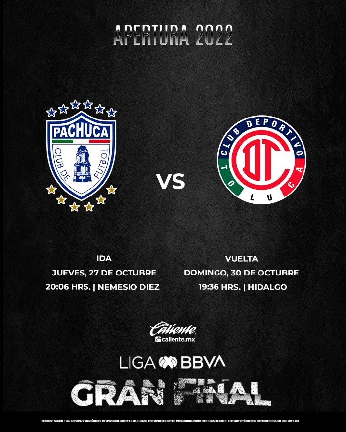 Este lunes, la Liga MX dio a conocer los días y los horarios de los partidos de la Gran Final del Torneo Apertura 2022.El partido de ida será este jueves 27 de octubre, cuando Toluca sea anfitrión ante los Tuzos en el Estadio Nemesio Diez, en punto de las 20:06 horas.Todo se definirá el domingo 30, cuando Pachuca le haga los honores a los Diablos Rojos en el partido de vuelta de la Final en el Estadio Hidalgo, a las 19:36 horas.Por primera vez en la historia, el Pachuca y el Toluca dirimirán al campeón del futbol mexicano, pero será la sexta ocasión que se enfrentan en una Liguilla.Para los hidalguenses será la segunda final consecutiva, luego de que disputaran la del pasado Torneo Clausura 2022 ante Atlas, serie que también se definió en su casa, pero que perdieron con marcador global de 3-2.OF