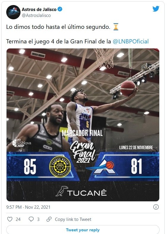 El partido se mantuvo en el alambre hasta los últimos segundos. Fuerza Regia sacó la casta y derrotó 85-81 a Astros de Jalisco para barrer la Final por el título con cuatro victorias y proclamarse así bicampeones de la Liga Nacional de Baloncesto Profesional (LNBP).Astros contó con sólo siete jugadores para el partido de esta noche y las ausencias terminaron pesando. Fuerza Regia aprovechó y vino de atrás para conquistar la victoria del bicampeonato.A base de triples, presión alta y una buena defensa, Astros arrancó a tambor batiente el encuentro y en menos de cuatro minutos ya lo ganaban 15-3.La quinteta tapatía estaba encendida. Demostraba que podía ganar el partido para seguir con vida, y silenciaba de momento a todo el graderío del Gimnasio Nuevo León Independiente. Astros se llevó el primer cuarto 26-17, pero con el pasar de los minutos resintieron las ausencias de Avry Holmes y Jorge Gutiérrez.Contrario al equipo jalisciense, Fuerza Regia renovó todas sus piezas para el segundo cuarto y fueron amplios dominadores.La ofensiva de Astros se desgastó y se fueron sin puntos en los últimos cuatro minutos del segundo periodo, situación que aprovechó Fuerza Regia para tomar la delantera 41-39 tras el descanso del medio tiempo.Astros jugó con el corazón toda la segunda mitad. Elementos como Jordan Loveridge, Jared Frame y Blake Javion disputaron más de 32 minutos cada uno y aun así el equipo mantenía el empate 81-81 restando sólo dos minutos de partido.Pero sería el triple de Cristian Cortéz el que marcaría la diferencia en los últimos segundos y Fuerza Regia conquistó así la victoria final de 85-81 para consagrarse como bicampeones de la LNBP, hazaña que habían logrado por última vez los Halcones de Xalapa en 2010.Fuerza Regia conquistó así su cuarto título para las vitrinas y empató a las escuadras de Soles de Mexicali y Halcones de Xalapa como los equipos más ganadores en la historia de la Liga.JM
