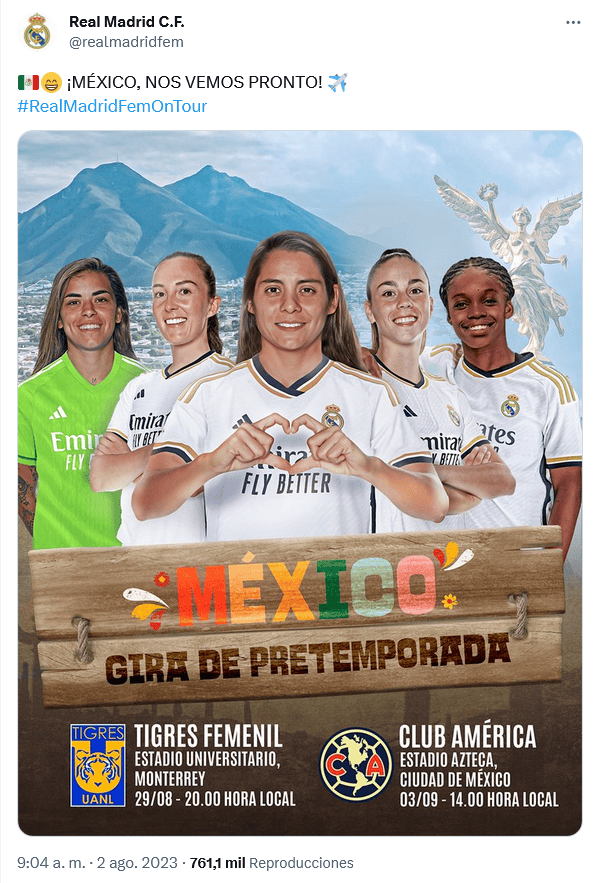 Como parte de sus trabajos de preparación previo a la campaña 2023-2024, Real Madrid Femenino jugará en tierras mexicanas, específicamente en los estadios Azteca y Universitario. Las dos más recientes escuadras campeonas de nuestra liga local, América y Tigres, serán las anfitrionas de Kenti Robles y compañía; las merengues vivirán su primera experiencia en México tras cuatro años desde la fundación del equipo femenil. Durante este tiempo de existencia del Real Madrid, el club ha logrado dos subcampeonatos da la Liga F, un tercer lugar en la Primera Iberdrola, y en Champions League lograron meterse hasta los cuartos de final en la 2021-22; por lo que los conjuntos mexicanos tendrán una importante prueba cuando se midan ante las españolas. Primero serán las Amazonas en recibirlas el 30 de agosto en el Volcán, el juego está pactado a las 20:00 horas y ya se pueden adquirir los boletos para asistir a este evento internacional, el costo de ellos va desde los 300 hasta los 700 pesos y se pueden comprar a través de la plataforma boletomóvil. Posteriormente, las dirigidas por Alberto Toril viajarán a la CDMX para medirse ante las Águilas el domingo 03 de septiembre a las 14:00 horas en el coloso de Santa Úrsula, para este encuentro aún se desconoce el precio de las entradas. Sin embargo, la preventa azulcrema será del 7 al 10 de agosto, mientras que la venta general saldrá el 11 del presente mes.OF