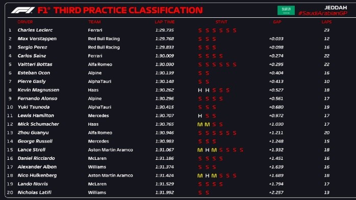 El piloto Charles Leclerc, de Ferrari, -primero del campeonato- lideró, por delante del neerlandés Max Verstappen -último campeón del mundo- y del mexicano Sergio "Checo" Pérez, los dos pilotos de Red Bull, el tercer y último entrenamiento libre para el Gran Premio de Arabia Saudita 2022, el segundo del Mundial de F1, que se disputa en Yeda.En la mejor de sus 23 vueltas, Leclerc cubrió -con neumático blando, con el que todos marcaron sus mejores tiempos- los seis mil 145 metros del circuito de Yeda -con largas rectas y 27 curvas, de ellas muchas rápidas- en un minuto, 29 segundos y 735 milésimas, solo 33 menos que Verstappen, que dio 12, y con 98 sobre "Checo" Pérez, que dio 16; en una sesión en la que el madrileño Sainz giró 22 veces y fue cuarto, a 274 milésimas.Tras una larga noche de reuniones que no concluyeron hasta casi las dos y media de la mañana, los pilotos, que se plantearon la posibilidad de no seguir corriendo a causa del atentado de ayer viernes a una petrolera situada a unos 15 kilómetros, decidieron finalmente que el Gran Premio de Arabia Saudita 2022 siguiera su curso. En la mañana de este sábado, tanto la FIA como la F1 hicieron público un comunicado confirmando esta circunstancia; por lo que los coches comenzaron a rodar a las cinco de la tarde hora local, en un ensayo que no resultó del todo relevante, ya que, a diferencia de la calificación y la carrera, se disputó de día y no con luz artificial.OF