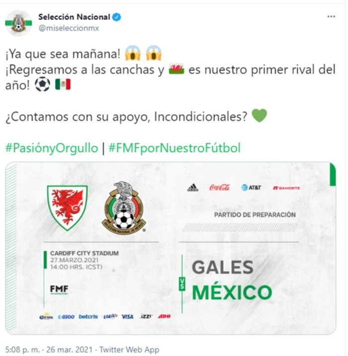 La Selección Mexicana regresa a territorio europeo para enfrentar su primer partido amistoso del 2021 cuando choque ante su similar de Gales en la ciudad de Cardiff. El equipo de Gerardo Martino comienza su preparación de cara a las eliminatorias mundialistas rumbo a Qatar 2022.Esta será la quinta ocasión que ambas selecciones se vean las caras. La última fue en el Rose Bowl de Los Ángeles en un partido de preparación rumbo a la Copa del Mundo de Rusia 2018, este compromiso terminó sin anotaciones.La Selección de Gales será la primera prueba para el Tricolor en la primera Fecha FIFA del año. El otro duelo será ante Costa Rica, programado para el próximo martes 30 de marzo en Austria. El partido de la Selección Mexicana contra el país de Gales se celebrará el sábado 27 de marzo.OF