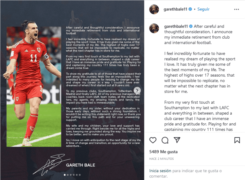 De última hora, el galés Gareth Bale dio a conocer que se retira del futbol de manera oficial.Con un sensible mensaje difundido en sus redes sociales, el delantero señaló que deja las canchas a nivel clubes y selección a los 33 años.En sus redes sociales, Gareth Bale publicó una carta con la que destaca su trabajo a lo largo de 17 temporadas:"Después de una consideración cuidadosa y reflexiva, anuncio mi retiro inmediato del futbol de clubes e internacional. Me siento increíblemente afortunado de haber realizado mi sueño de practicar el deporte que amo. Realmente me ha dado algunos de los mejores momentos de mi vida. El más alto de los máximos en 17 temporadas, que será imposible de replicar, sin importar lo que me depare el próximo capítulo".Indica de manera sensible que: "Desde mi primer toque en Southampton hasta mi último con LAFC y todo lo demás, dio forma a una carrera en el club por la que tengo un inmenso orgullo y gratitud. Jugar y capitanear a mi país 111 veces ha sido realmente un sueño hecho realidad".Aprovecha también para: "Mostrar mi gratitud a todos aquellos que han jugado su papel a lo largo de este viaje, se siente como una imposibilidad. Me siento en deuda con muchas personas por ayudarme a cambiar mi vida y dar forma a mi carrera de una manera que nunca podría haber soñado cuando comencé a los 9 años. A mis clubes anteriores, Southampton, Tottenham, Real Madrid y finalmente LAFC. Todos mis gerentes y entrenadores anteriores, personal de trastienda, compañeros de equipo, todos los fanáticos dedicados, mis agentes, mis increíbles amigos y familiares, el impacto que ha tenido es inconmensurable. Mis padres y mi hermana, sin su dedicación en esos primeros días, sin una base tan sólida, no estaría escribiendo esta declaración en este momento, así que gracias por ponerme en este camino y por su apoyo inquebrantable. Mi esposa y mis hijos, su amor y apoyo me han sostenido. Justo a mi lado en todos los altibajos, manteniéndome conectado a tierra en el camino. Me inspiras a ser mejor y te enorgullezco".El galés cierra su mensaje con un: "Entonces, sigo adelante con anticipación a la siguiente etapa de mi vida. Un tiempo de cambio y transición, una oportunidad para una nueva aventura…".Entre los logros de Gareth Bale está el haber sido fichado por el Real Madrid en 2013 por 100 millones de euros, lo que lo hizo el traspaso más caro de la historia del futbol, por encima de los 94 millones que el equipo había pagado por Cristiano Ronaldo en 2009, o los 75 que pagó por Zinedine Zidane en 2001.Con el equipo merengue ganó tres títulos de Liga (2016-2017, 2019-2020, 2021-2022); cinco Champions League (2013-2014, 2015-2016, 2016-2017, 2017-2018, 2021-2022); tres Supercopas de España (2017-2018, 2019-2020, 2021-2022); una Copa del Rey (2013-2014); tres Supercopas de Europa (2014-2015, 2016-2017, 2017-2018); y cuatro Mundiales de Clubes (2014, 2016, 2017, 2018).También cuenta con un título de la Copa de Liga inglesa (con Tottenham en 2008) y uno de la MLS (con Los Angels FC en 2022).Con la Selección de Gales, participó desde el año 2006 y destacan el haberla guiado a dos Eurocopas (jugando hasta semifinales en 2016 y octavos de final en 2020), y haber clasificado a Qatar 2022, su primer Mundial en 64 años.OF