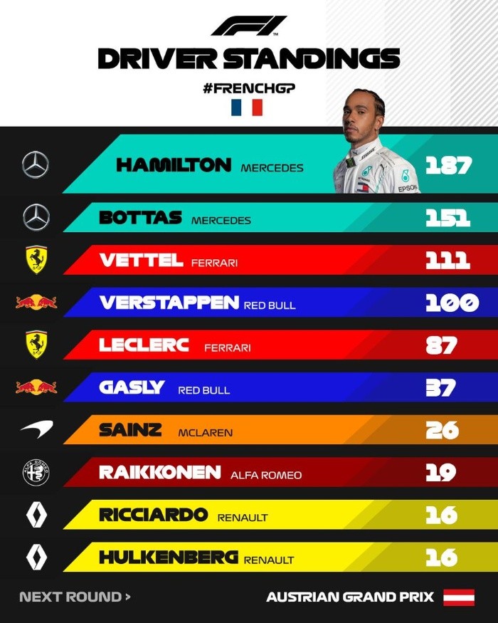 El británico Lewis Hamilton sólo necesitó unos cuantos segundos ayer para tomar el control del Gran Premio de Francia.Una vez que aceleró desde la primera posición de largada, dejó a su coequipero de Mercedes, Valtteri Bottas, atrás y no se vio bajo presión en 53 vueltas.Su cuarta victoria seguida, sexta en lo que va de la temporada de la Fórmula Uno y 79 de su carrera, se vio fácil cuando terminó 18 segundos por delante de Bottas y 19 frente a Charles Leclerc, de Ferrari.El título en el circuito francés lo colocó 36 puntos por encima de Bottas y 76 sobre el tercer sitio Sebastian Vettel, de Ferrari, en su búsqueda por un sexto campeonato mundial, cuyas probabilidades de obtenerlo aumentan cada vez más.Sigue siendo una hazaña poco probable de lograr, pero si Hamilton gana las 13 carreras restantes de la temporada, romperá el récord de Michael Schumacher de 91 victorias en la máxima categoría del automovilismo.Sin embargo, a pesar de su contundente dominio, Hamilton está de acuerdo con los fanáticos de la Fórmula Uno que quieren eventos más emocionantes y anhelan los duelos de rebases que les daban a las carreras una ventaja impredecible.“Si dicen que es aburrido, lo entiendo completamente”, comentó el británico después de ganar. “No culpo a los pilotos. Nosotros no escribimos las reglas. Presionen a los de allá arriba, quienes deberían estar haciendo su trabajo. Ellos han cometido errores durante muchos, muchos años”.La escudería Mercedes, a la que pertenece Hamilton, es la favorita para llevarse tanto el campeonato de pilotos como el de constructores por sexto año consecutivo. De 2010 a 2013 Red Bull hizo lo mismo cuando Vettel ganó sus cuatro títulos de la Fórmula Uno.Pero a lo que en realidad se refiere Hamilton es que, aunque Ferrari presionó a Mercedes durante 2017 y 2018, las temporadas se asemejan entre sí en términos de que hay un dominio abrumador de una escudería sobre el resto.Para remediar la situación, el británico quiere que los pilotos sean consultados en el proceso de toma de decisiones rumbo a 2021, cuando se aprobarán nuevas normas.Dichas reglas todavía tienen que ser definidas por la Federación Internacional del Automóvil, en medio de los distintos intereses de los equipos.Los pilotos deberían tener una mayor influencia en ese tipo de cuestiones, señaló Hamilton.