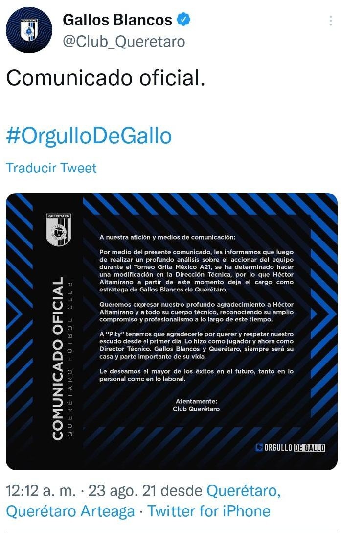 Cae la primera cabeza del Torneo Apertura 2021 de la Liga MX.Tras la derrota del Querétaro por 2-0 ante el Pachuca en la jornada 6 de la Liga MX, Héctor ''Pity'' Altamirano presentó su renuncia a los Gallos Blancos. Luego, el equipo informó que tras los malos resultados determinó hacer una modificación, por lo que a partir de este lunes, el ''Pity'' deja su cargo como director técnico del primer equipo.''Queremos expresar nuestro profundo agradecimiento a Héctor Altamirano y a todo su cuerpo técnico, reconociendo su amplio compromiso y profesionalismo a lo largo de este tiempo'', dice el documento que publicaron en sus redes sociales.''A 'Pity' tenemos que agradecerle por querer y respetar nuestro escudo desde el primer día. Lo hizo como jugador y ahora como director técnico. Gallos Blancos y Querétaro, siempre será su casa y parte importante de sus vida''.En la conferencia de prensa posterior a la derrota de ayer domingo, Héctor Altamirano dijo:"Quiero agradecerle a la afición el apoyo, gracias porque sin ustedes esto no hubiera sido posible, hoy estoy en espera de lo que pueda suceder, con nuestra directiva nos sentaremos a platicar"."Recuerdo perfecto que llegué a esta institución como jugador en 2010 y desde ese día prometí defender a muerte este escudo y hoy incluso hay que defenderlo hasta de mí, así que sólo agradecerles y sólo esperamos a ver lo que pueda suceder", comentó.Al término de la J6 del Apertura 2021, Gallos Blancos de Querétaro suma tres puntos, resultado de tres empates y tres derrotas, y se encuentra en la posición 16 de la tabla general.¿Quieres saber más?Si quieres tener más contenido, más imágenes y aún más noticias, entonces descarga INFORMAPlus, la aplicación digital de EL INFORMADOR, donde tenemos materiales exclusivos para ti.Descarga la aplicación y pruébala GRATIS por treinta días.Si eres suscriptor de EL INFORMADOR tu acceso está incluido, solicítalo al 33 3678-7777OF