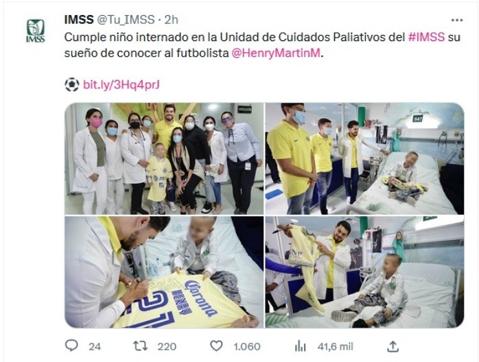 Henry Martín conquistó hace unas horas el campeonato de goleo del Clausura 2023 de la Liga MX, el atacante mexicano se convirtió en figura de las Águilas del América y con 14 goles se llevó el título individual.El buen momento del mexicano le ha permitido ganar un puesto importante en la Selección Mexicana y la admiración de millones de fanáticos americanistas, que lo ven como pieza clave para buscar el campeonato.Uno de esos admiradores fue el pequeño Braulio, quien está en la Unidad de Cuidados Paliativos del IMSS y que había expresado su deseo de conocer a Martín.La ilusión se volvió realidad este domingo en plena celebración del Día del Niño, ya que de manera sorpresiva el atacante del Tricolor visitó las instalaciones del hospital y pudo convivir con el pequeño.Durante unos minutos, Henry Martín pudo platicar con Braulio y regalarle una camiseta con una emotiva dedicatoria en la que le pidió seguir luchando y no darse por vencido.Ante la publicación, el mundo del balompié mexicano aplaudió lo realizado por Henry Martín y la agradeció ser una extraordinaria persona.JM